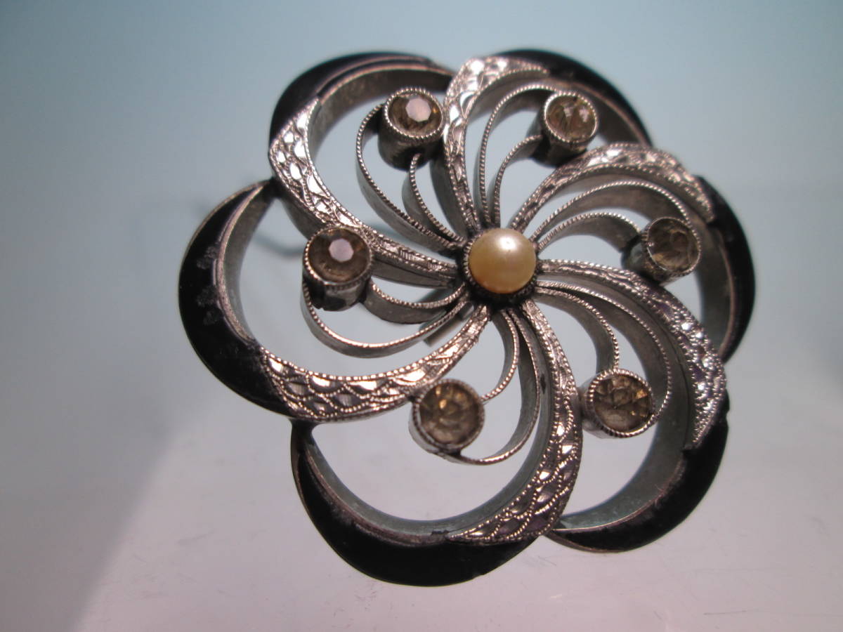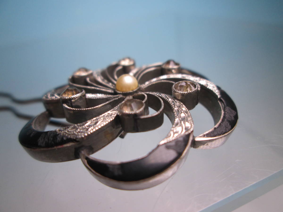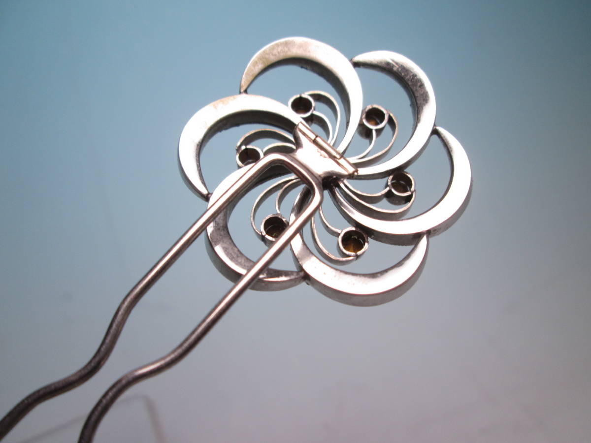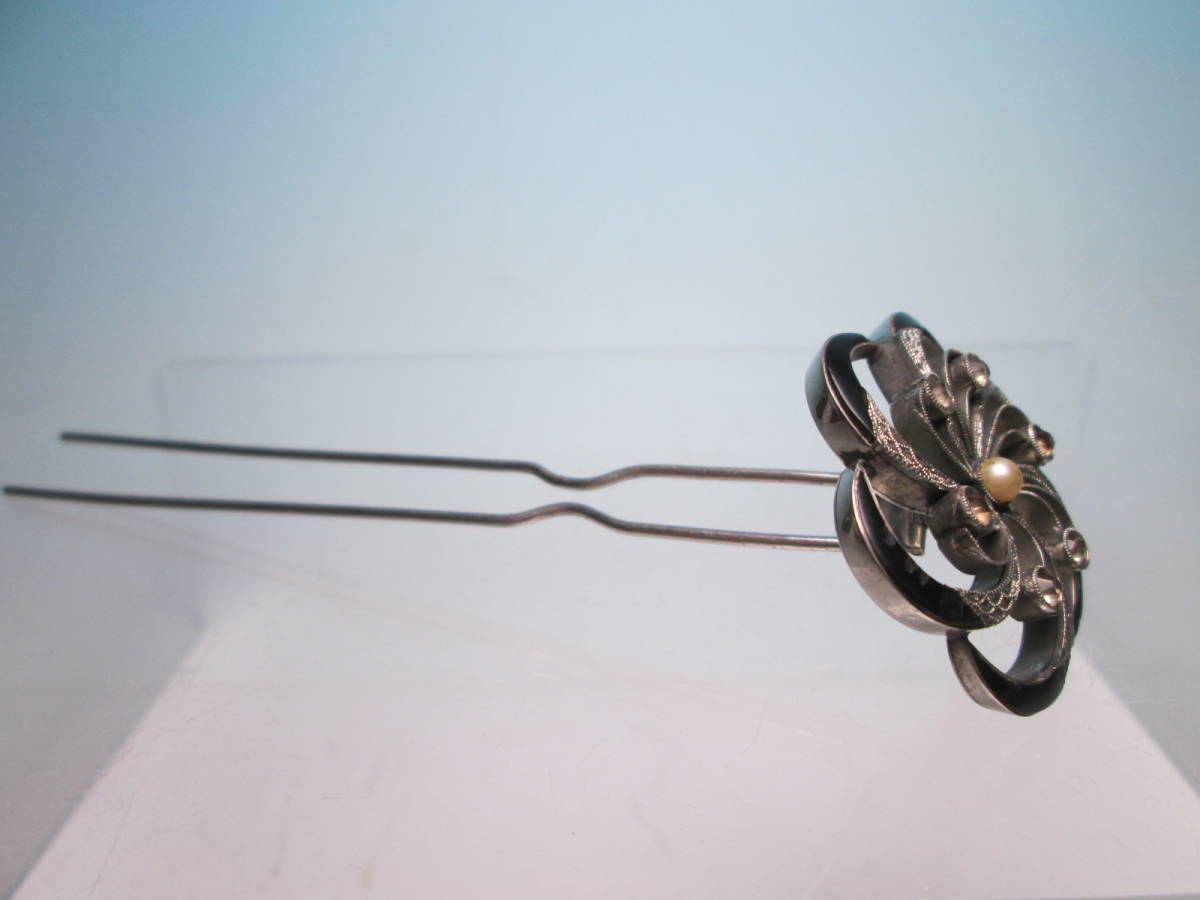 彫金細工にラインストーンと真珠を飾った可愛い簪です。刻印は有りません。