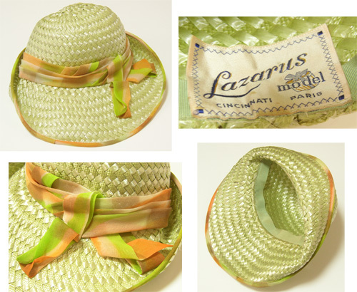 ヴィンテージ Lazarus レディース ハットです。状態は、古い物ですので、擦れや内側のスベリに汚れと、経年による色あせがありますが(画像4下)、ビンテージの雰囲気ある物です。アメリカで購入しました。デザインや作りがとても可愛いです。古い物ですので、状態はそれなりですが、年代物の風格とレトロ感ある珍しい物です。高さ14.5cm程、つばの最大幅11.5cm程、内周り54cm程です。ビンテージ物とご理解頂いて、ノークレーム、ノーリターンでお願いします。