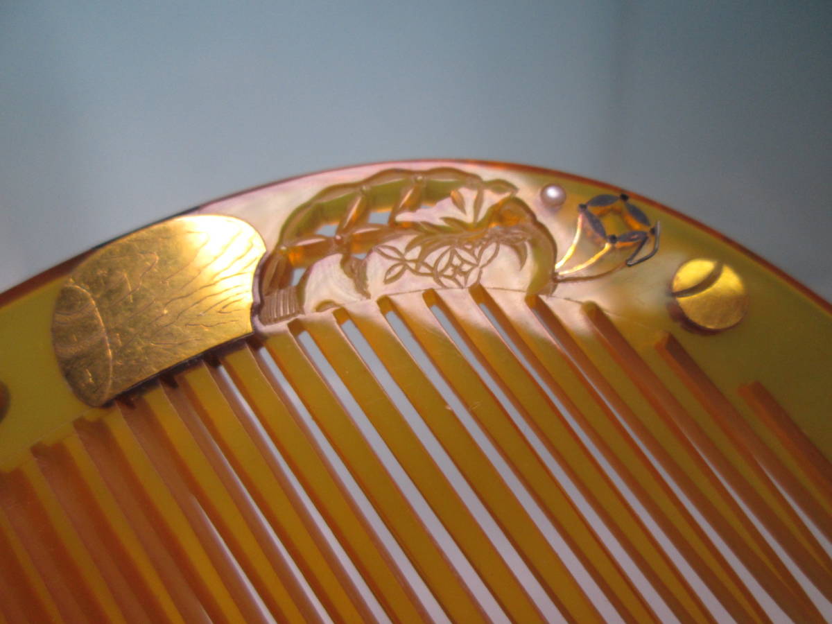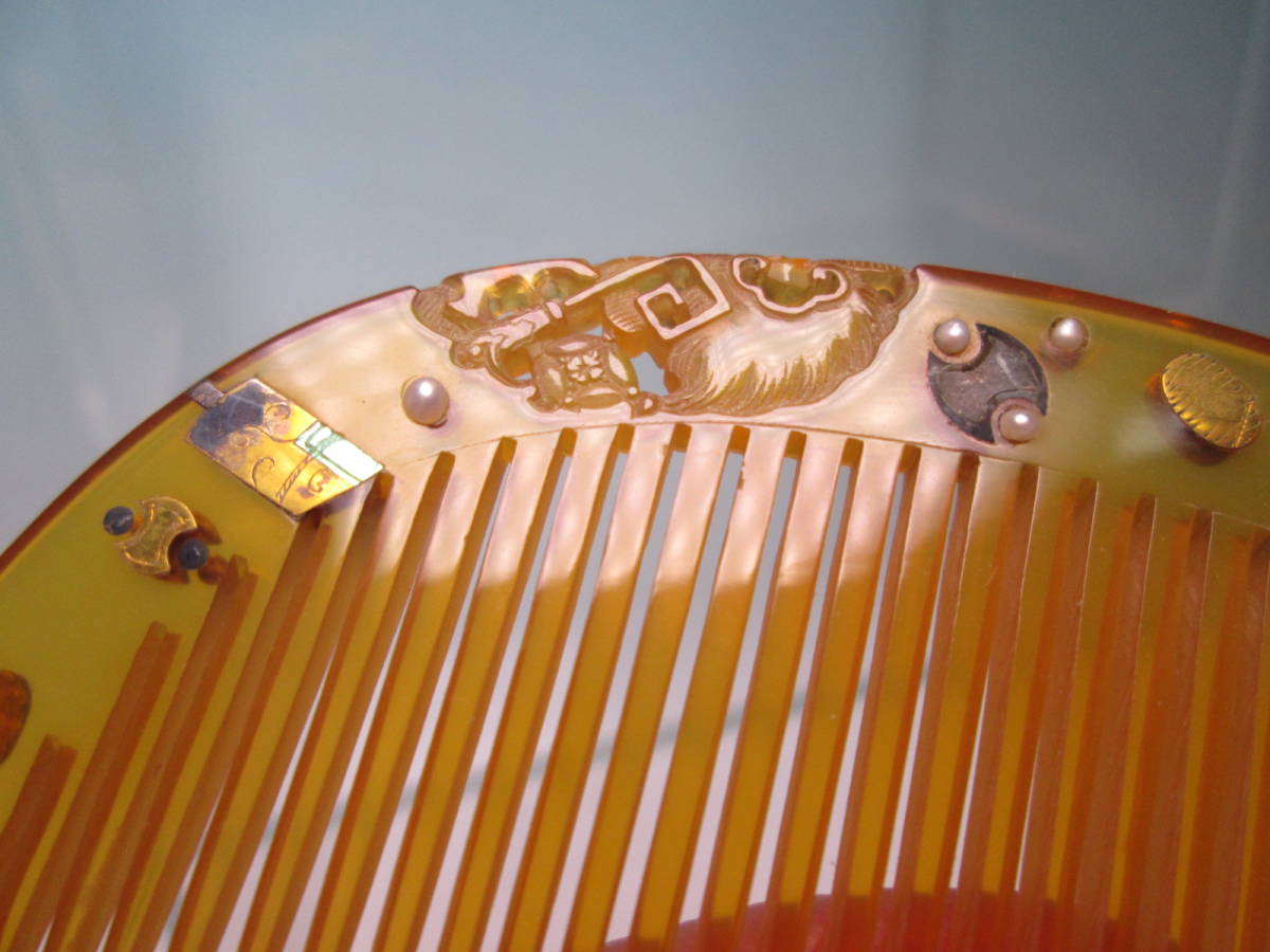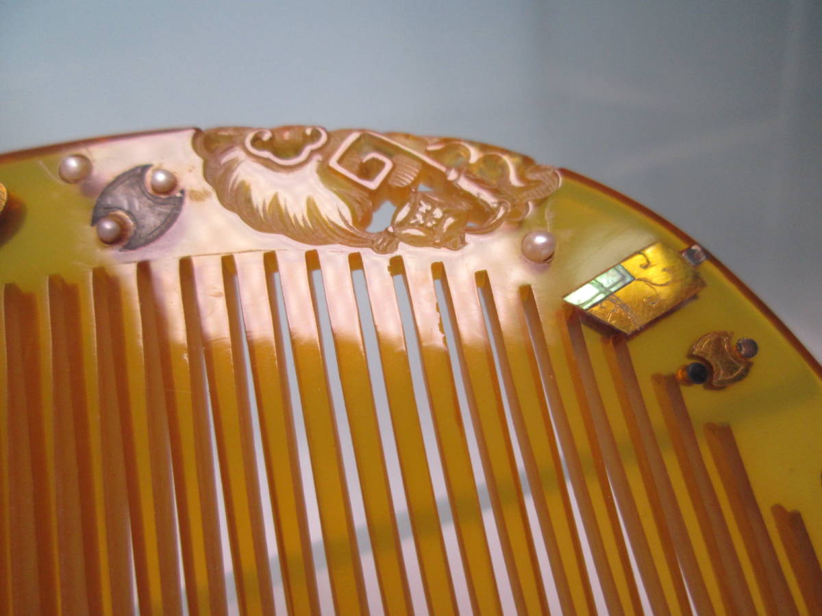 【江月】アンティーク・光月 本鼈甲 真珠飾り金細工宝尽くし文の櫛