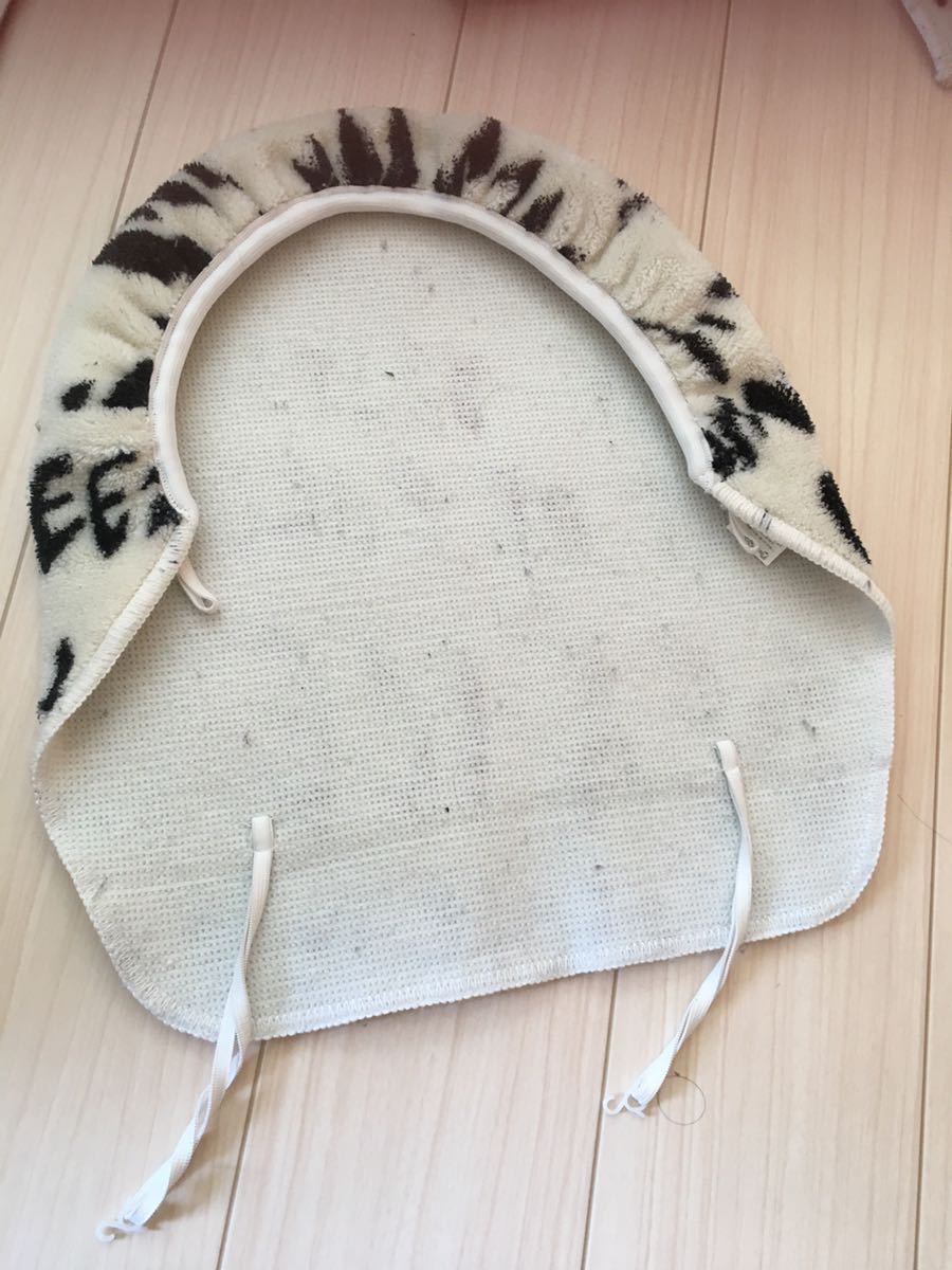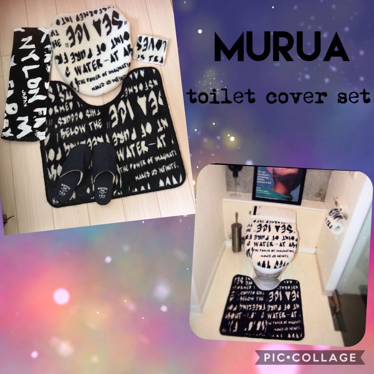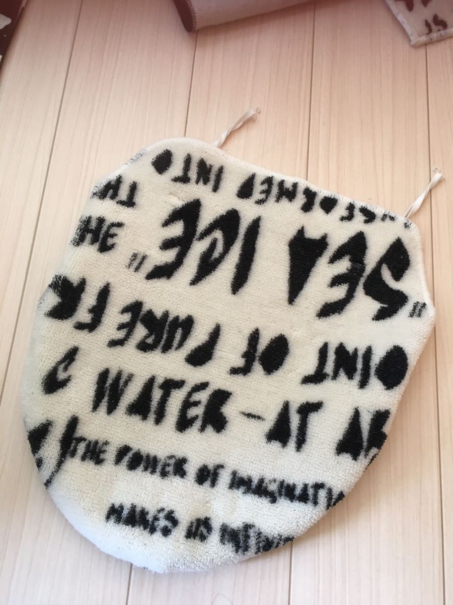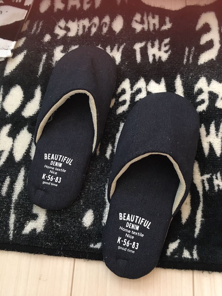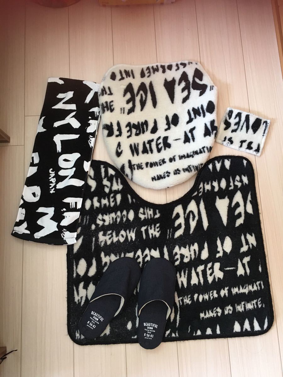カバー、マット、ペーパーホルダー、タオル、デニムスリッパのセットです。