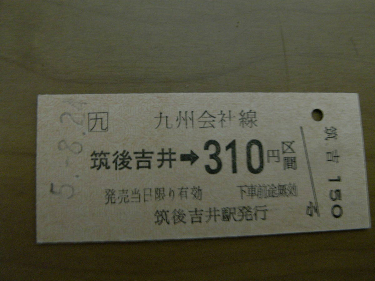 久大本線 筑後吉井→九州会社線310円 平成5年8月24日 筑後吉井駅発行
