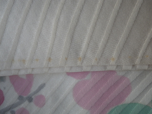 あくまで私見ですが柄がカラフルなものなので、シミ自体も良く見ないと柄の一部に感じられます。但し、最後の写真のシミは縫い目に沿って出ております(場所は向かって左側身頃横、太ももあたりです(上の詳細寸法の図の中の「10」の位置辺り))