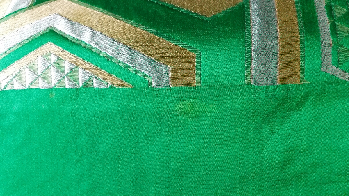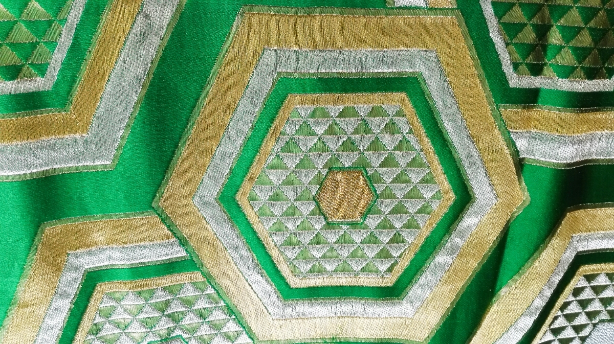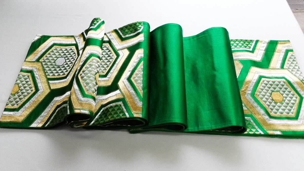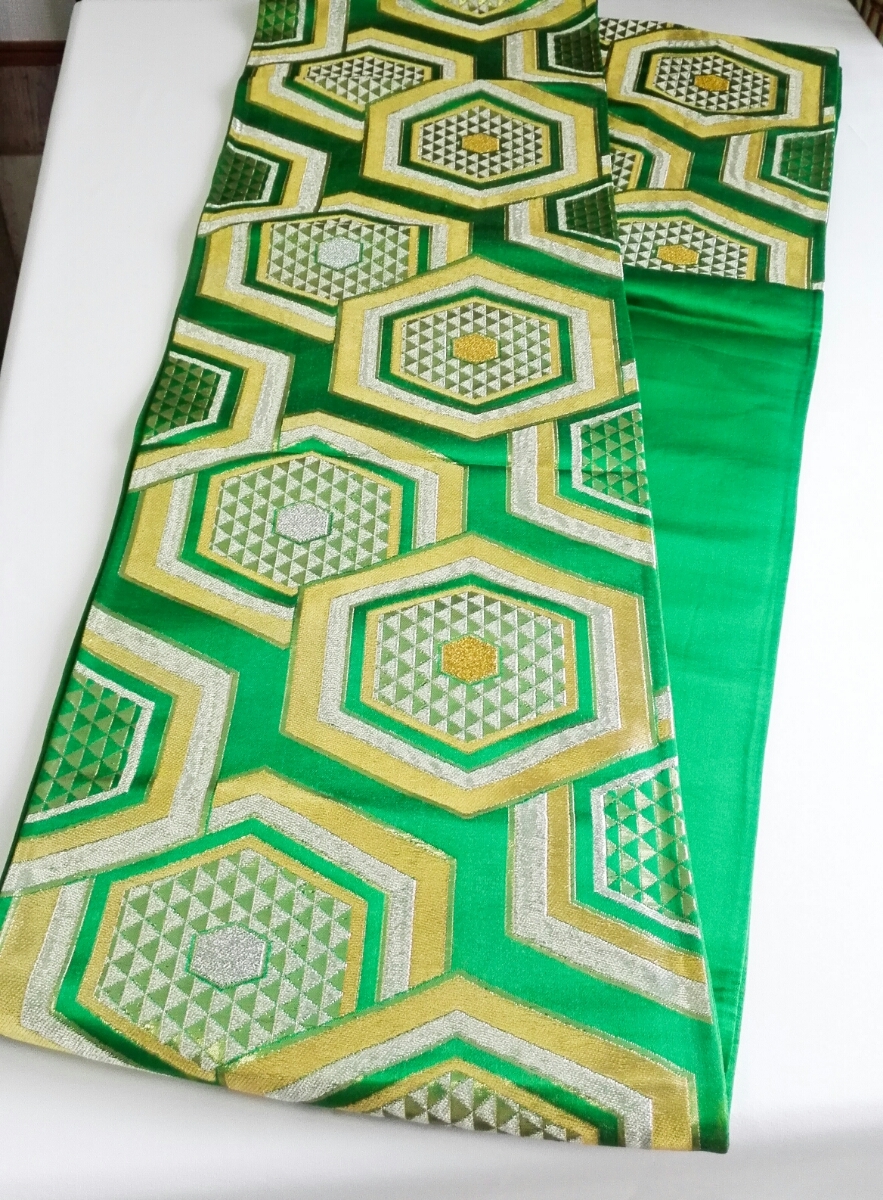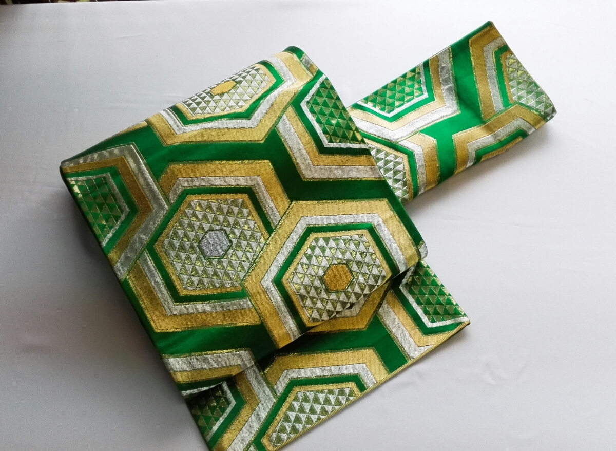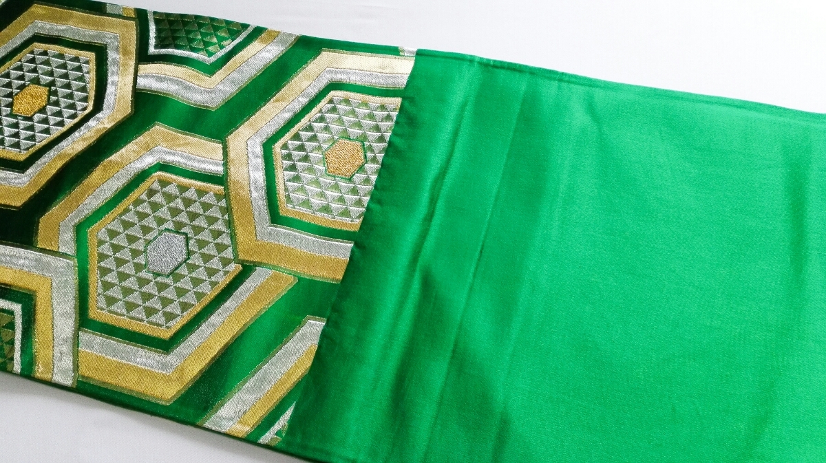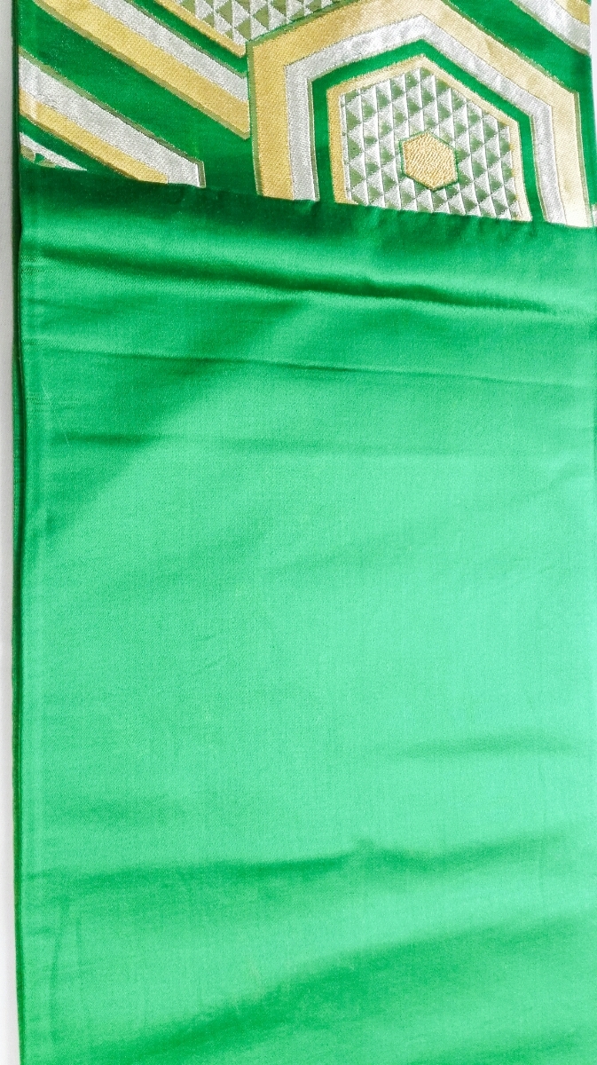 着物 袋帯 正絹 金糸 銀糸 亀甲模様 グリーン C -73の出品になります。