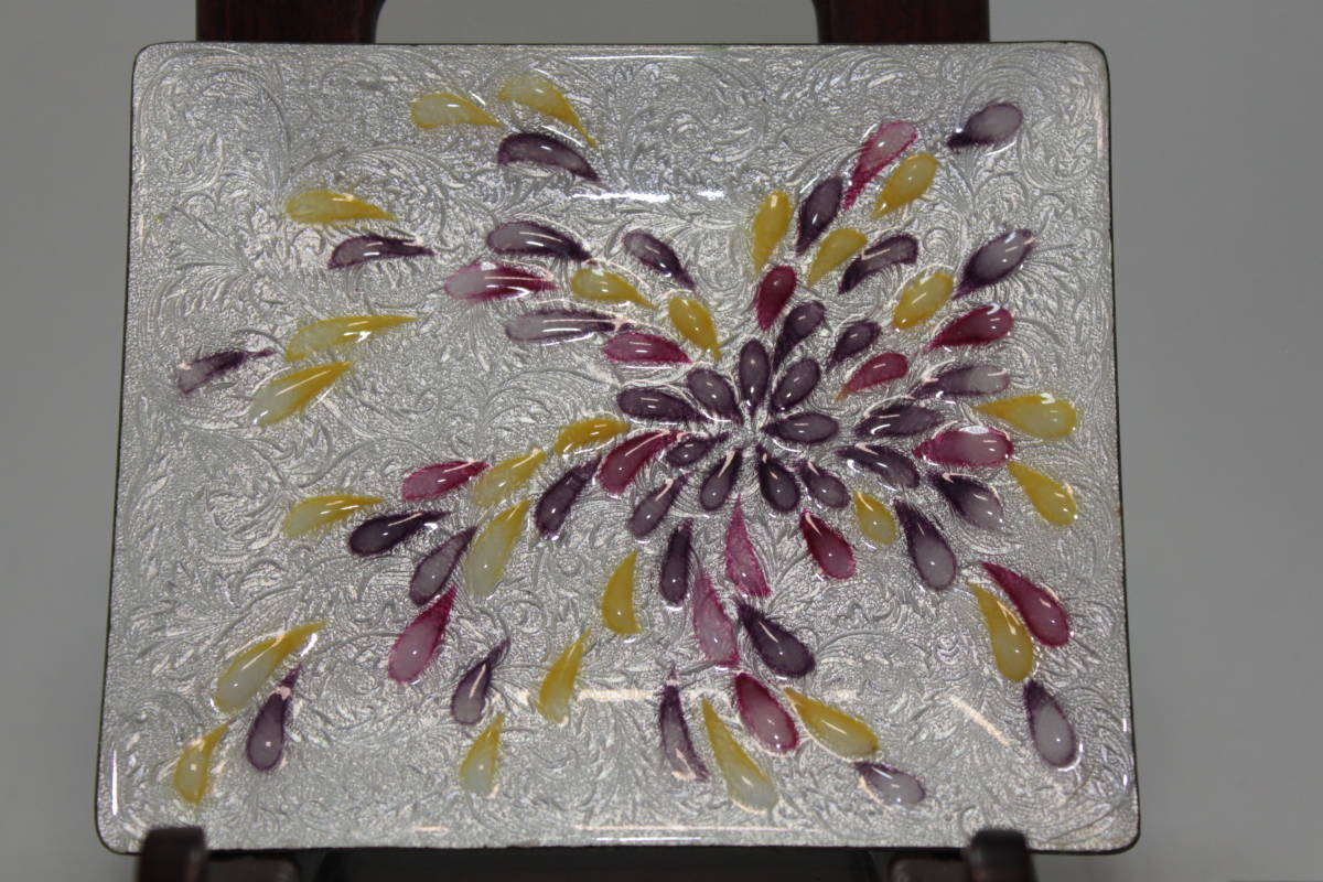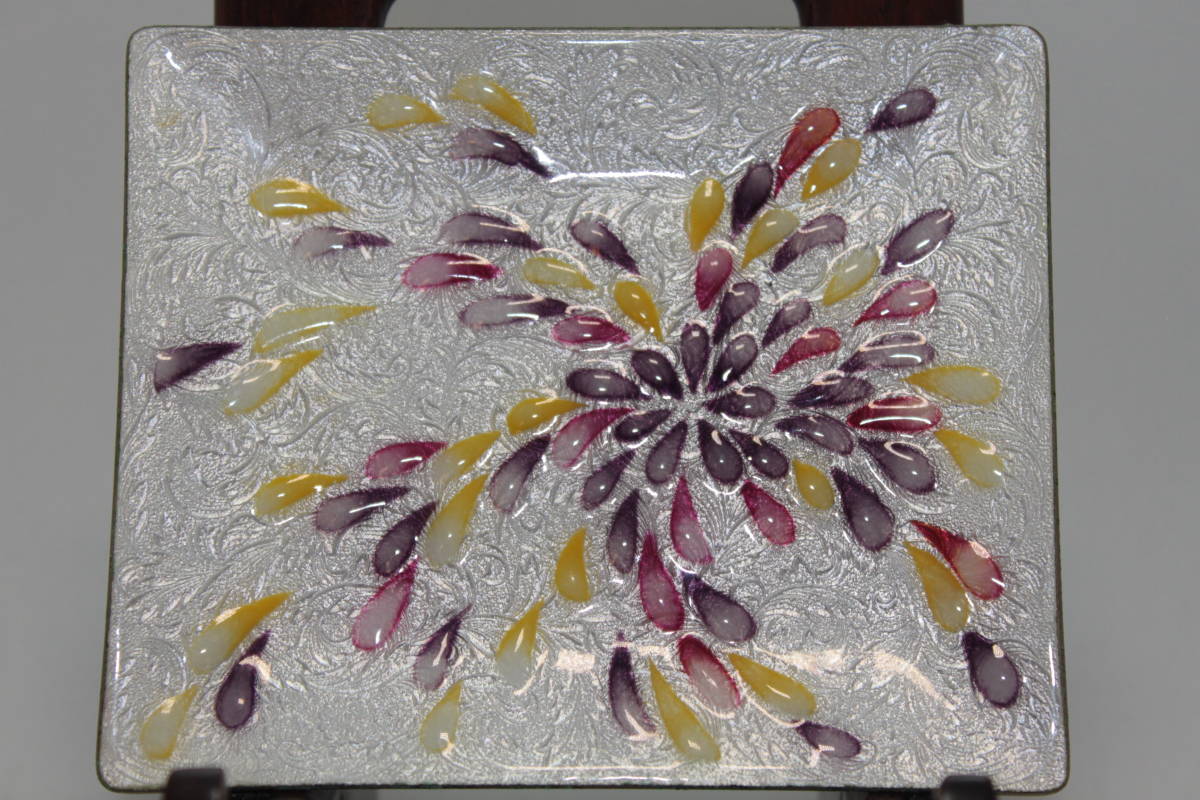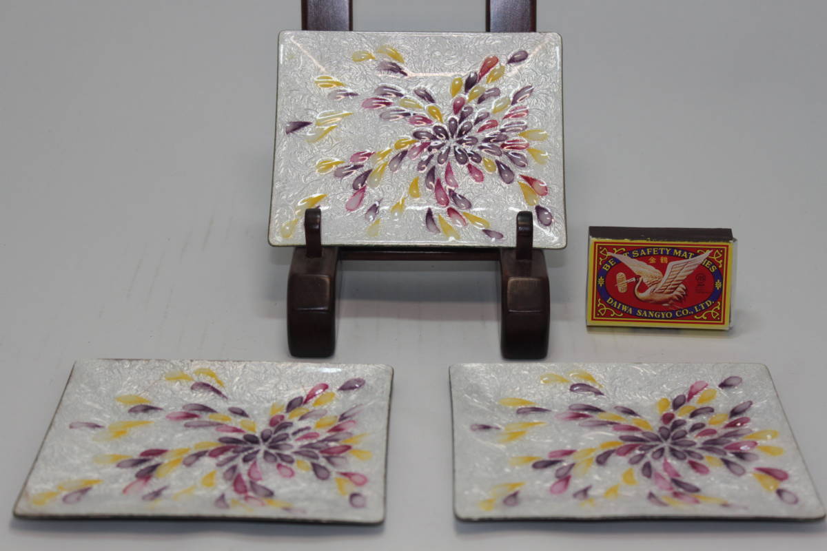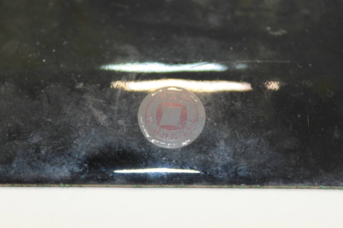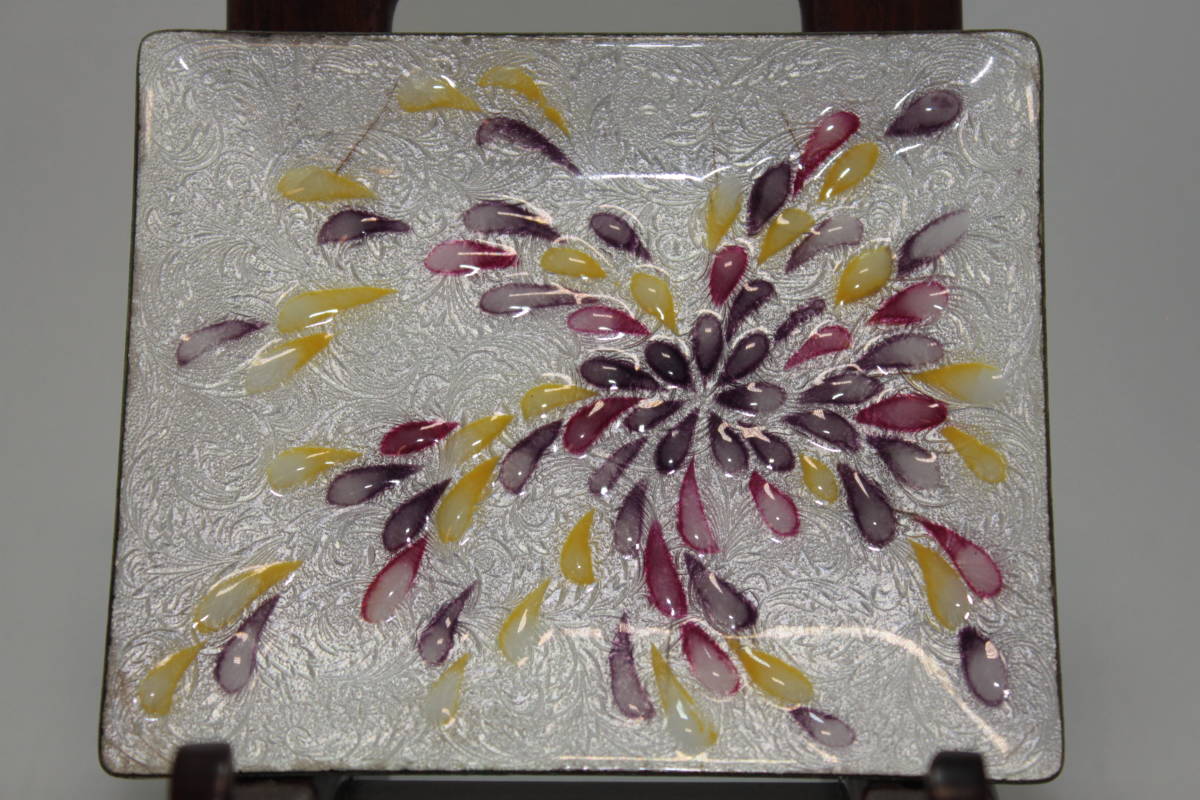 旧家に保管されていたもので、今回うぶ出しました。 彩色ガラスの裏面に、ホーロー板を合わせたおしゃれな柄の菓子皿です。 格安スタート、売り切りにて出品いたします。 ◎状態:サビ、アタリ、小キズ、スレ、汚れ等あります。その他、写真でご確認ください。 ◎大きさ(約.センチ):スケール(マッチ箱)でご確認ください。 |
