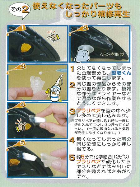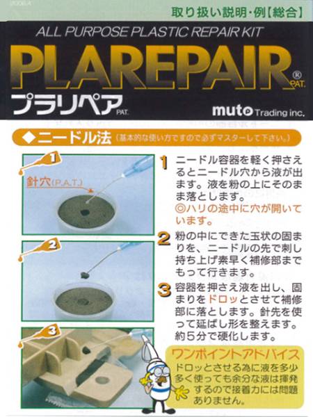 | 商品説明 | プラスチック製品の割れ・折れを修繕・補強(リペア)するための製品です。 専用の”粉”と”液”を混ぜて硬化させます。 数あるプラリペアのラインナップのなかで、PK-80は中級者用のセットです。 特に、初心者用のPL-16やPK-16で熟練度を高めた方にオススメです。 また、はじめて購入するという方でも 「おおよそ使い方のイメージがつかめている」 「あらかじめ多めに分量が必要」 という方に最適の製品です。 利用例をご用意いたしました、参考になさってください。 ※プラリペアシリーズの他の製品の例も含まれております、ご注意ください。 【セット内容】 プラリペアパウダー(黒):30g プラリペア専用リキッド:50mL 専用ニードル スポイト リキッド用容器 小分けカップ 型取くん2本 取り扱い説明書 車の部品の修正などに最適な量です。 修理する部品の色に合わせてお選び下さい。 ・割れ、折れ、欠けの接着剤で困っていませんか? ・模り(かたどり)も出来るプラリペアです。 ・車のパーツの修復、オートバイのカウル、ねじ穴の修復、おもちゃ、 パソコンなどあなたの大切な物の修復にプラリペアは欠かせません。 ・諦めてしまう前にぜひ、一度お試し下さい。 ・【プラリペアの長所】 ・エポキシ系より硬化が早く5分で固まります。 ・使いやすいので、なんでも修理したくなります。 ・瞬間接着剤など一度使ってまた使うとき中身が固まって使えないなんて経験ないですか? ・プラリペアは、粉と液の必要な分だけ使えます。 ・固まるとアクリル樹脂なので強度もバッチリです。 ・強度が強くノートパソコンなどのヒンジ部分もOK! ・硬化が早く5分で固まり仕事が速く進みます。 ・接着でのご使用でしたら少しの量で、経済的です。 ・必要な分量だけ混ぜて使いますので、長期保存可能です。 商品説明動画 |