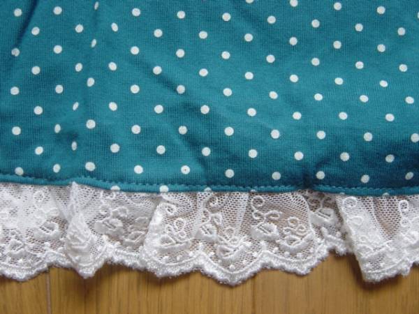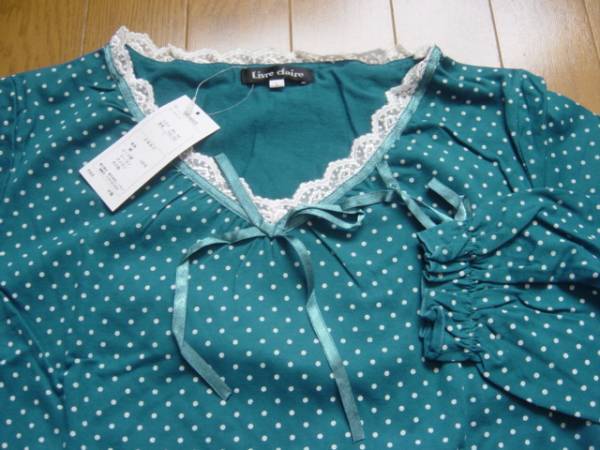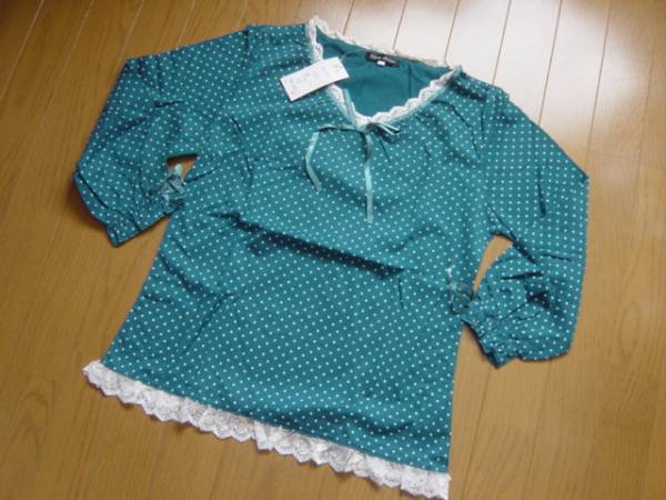 新品L★ドット柄ブルーグリーン七分袖カットソーレース&リボン