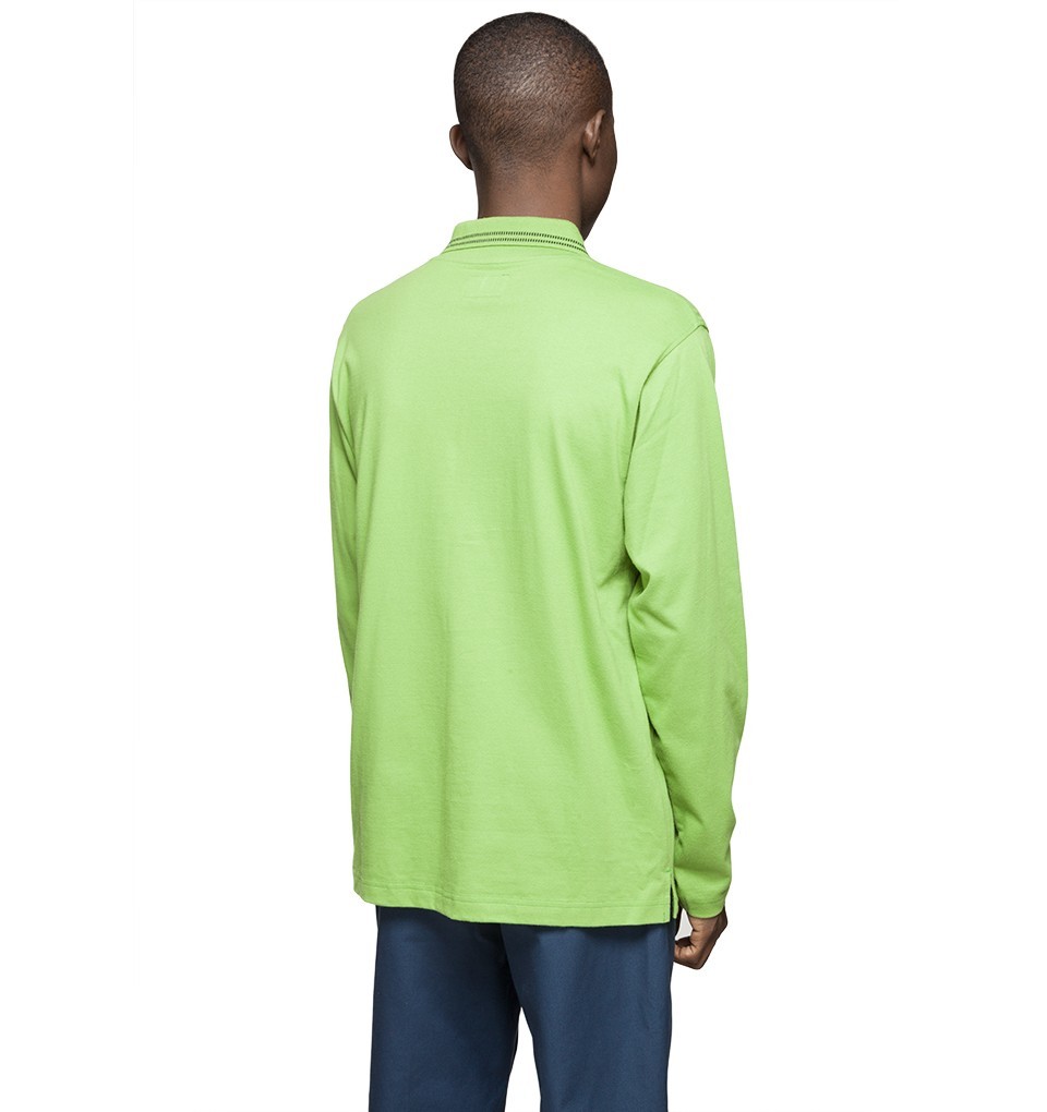 コットンジャージーをベースにジャカード織りの幾何学模様をポロ襟にあしらったロングスリーブポロ。左胸にはボディと同色のベーシックロゴが刺繍されています。