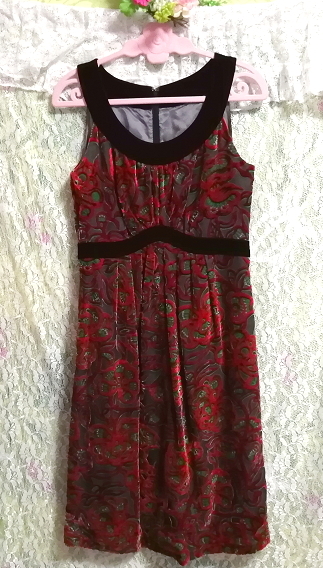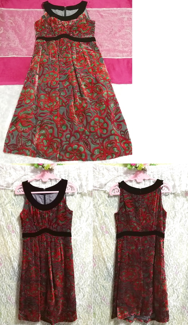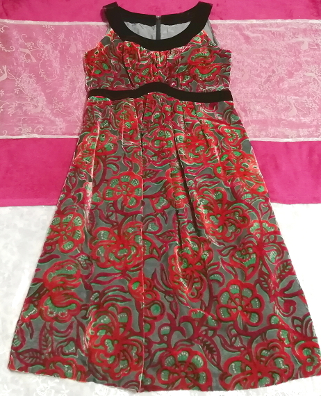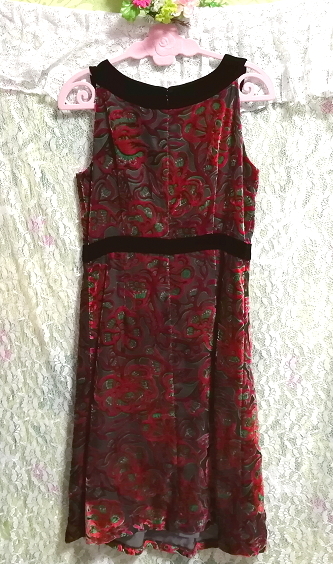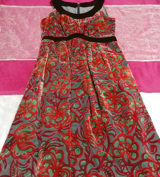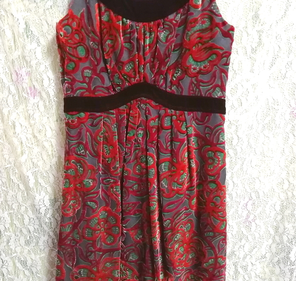 赤花柄ベロアノースリーブネグリジェチュニックワンピース Red flower pattern velour negligee sleeveless skirt tunic dress