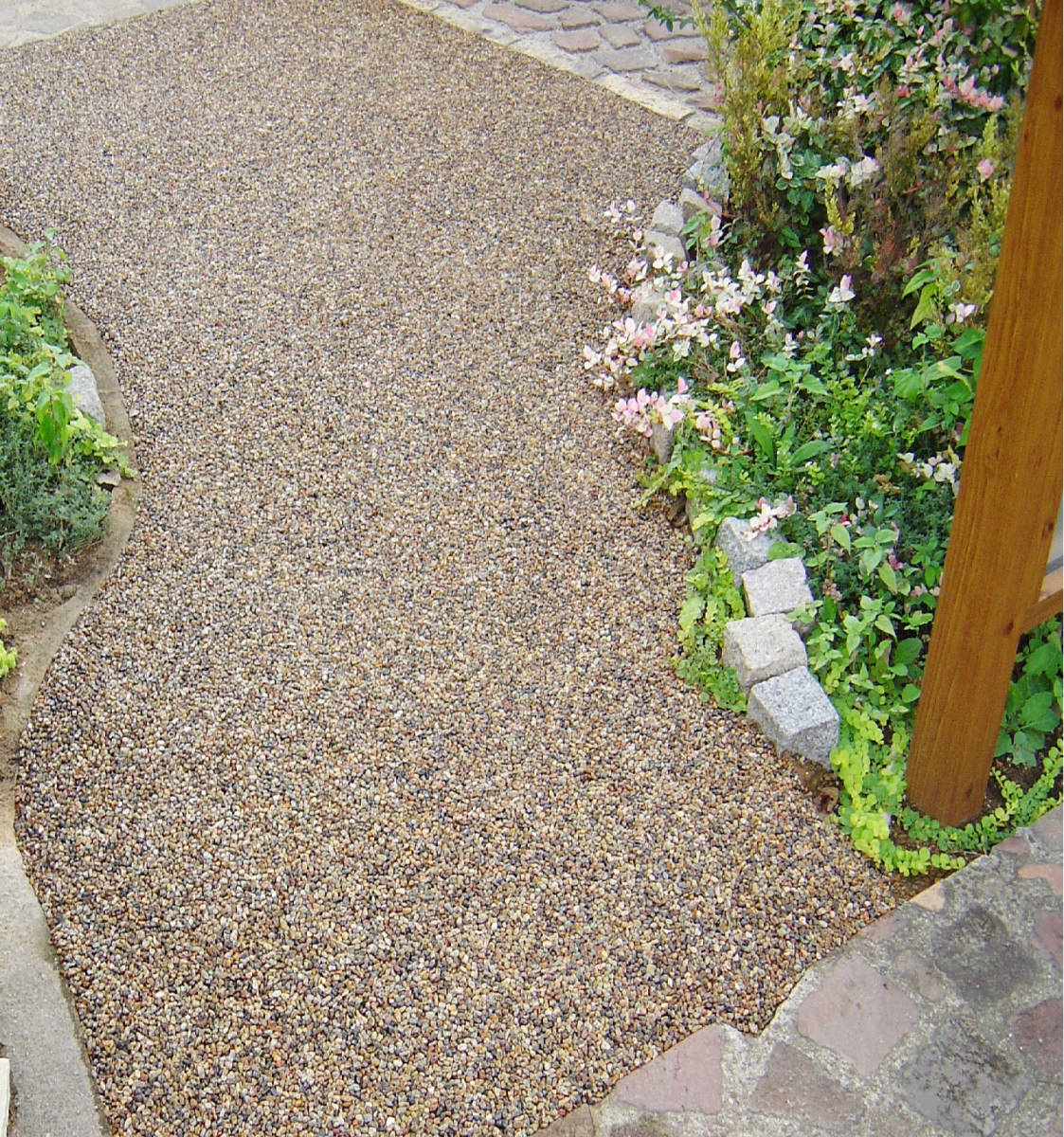 ※ 庭の雑草対策には、土の下地に砕石を50㎜厚程度で敷き固め、2~30㎜厚で、樹脂舗装します。