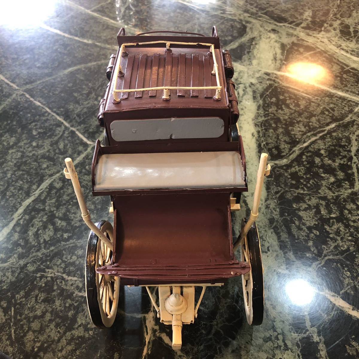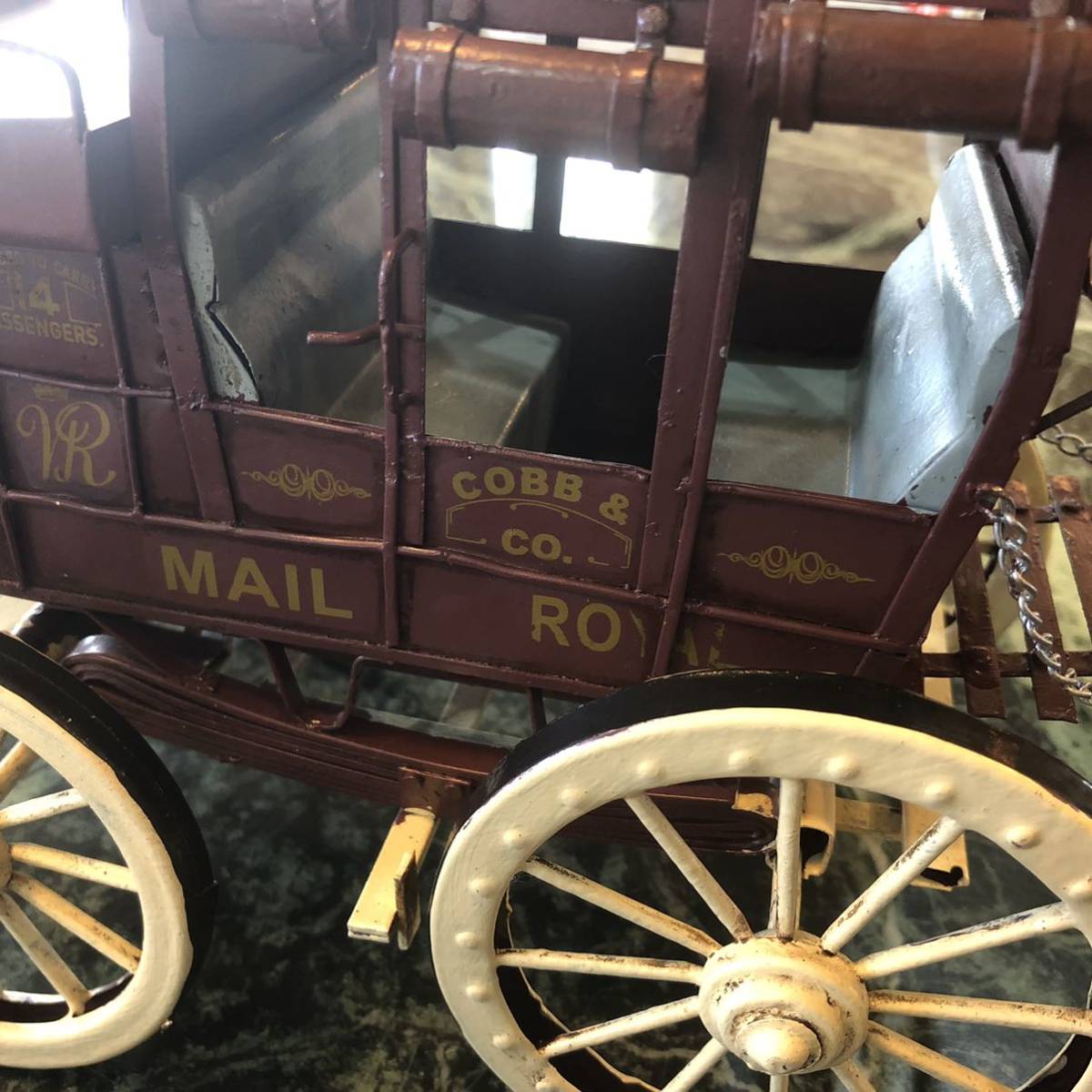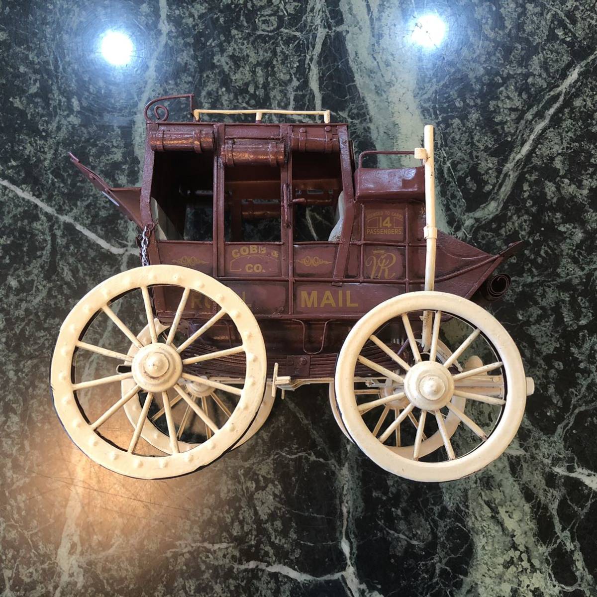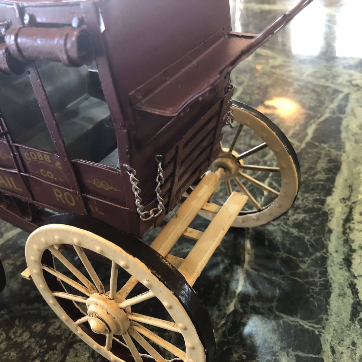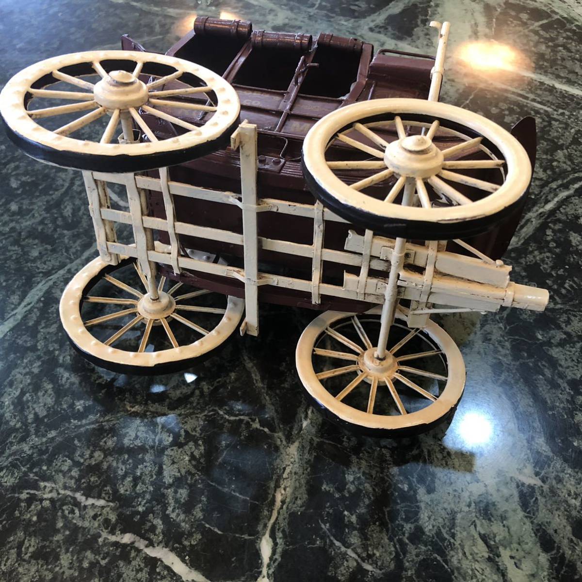 ブリキ製の馬車の置物です。車部分だけで、馬は付いておりません。アンティーク風の少し汚れているように見えるデザインになっております。