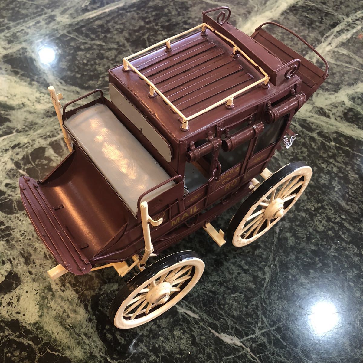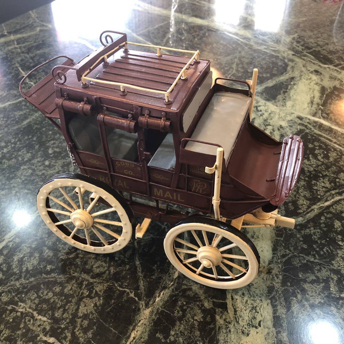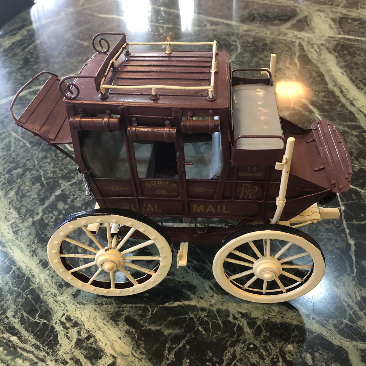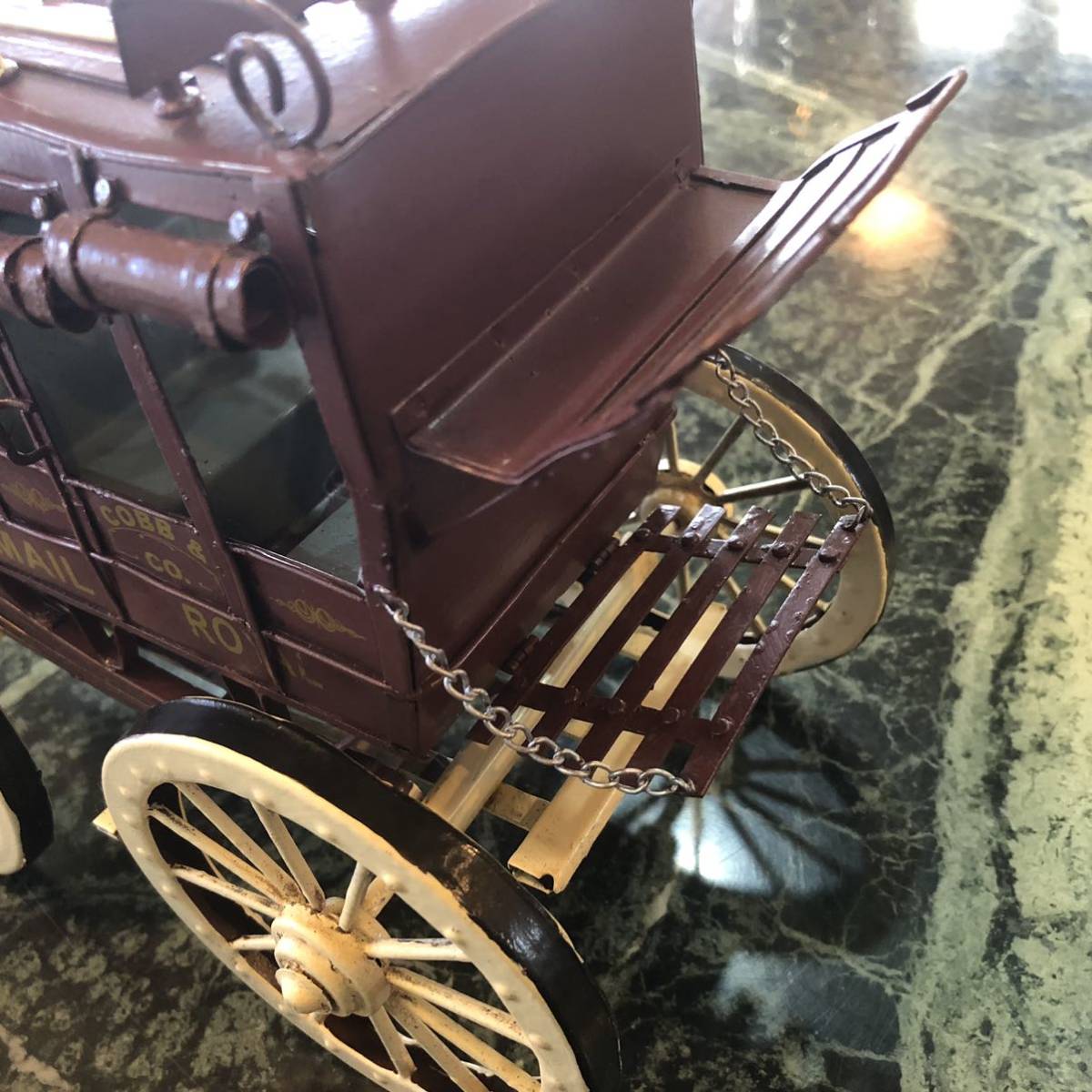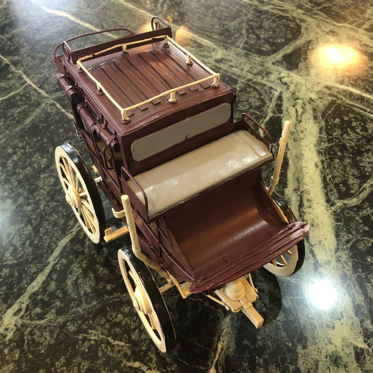 ブリキ製の馬車の置物です。車部分だけで、馬は付いておりません。アンティーク風の少し汚れているように見えるデザインになっております。