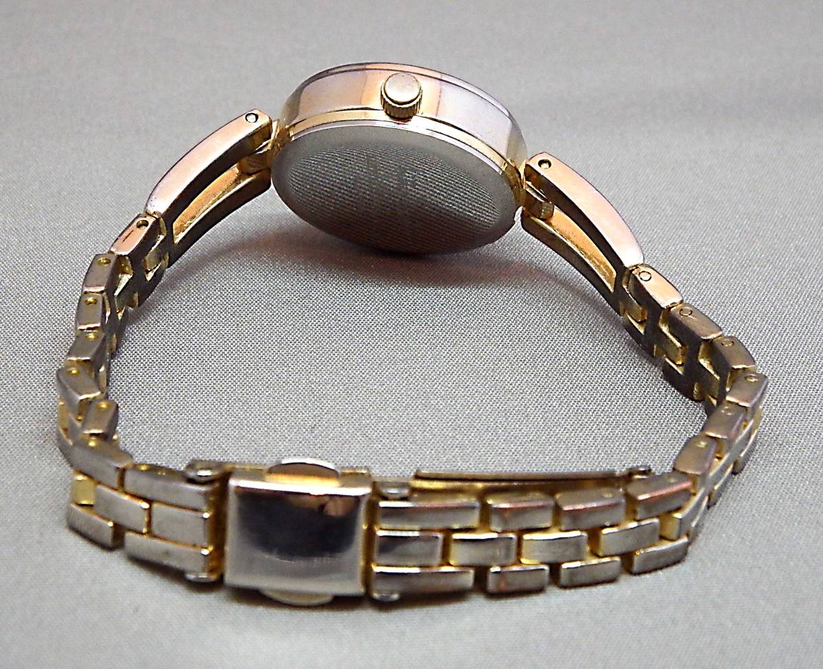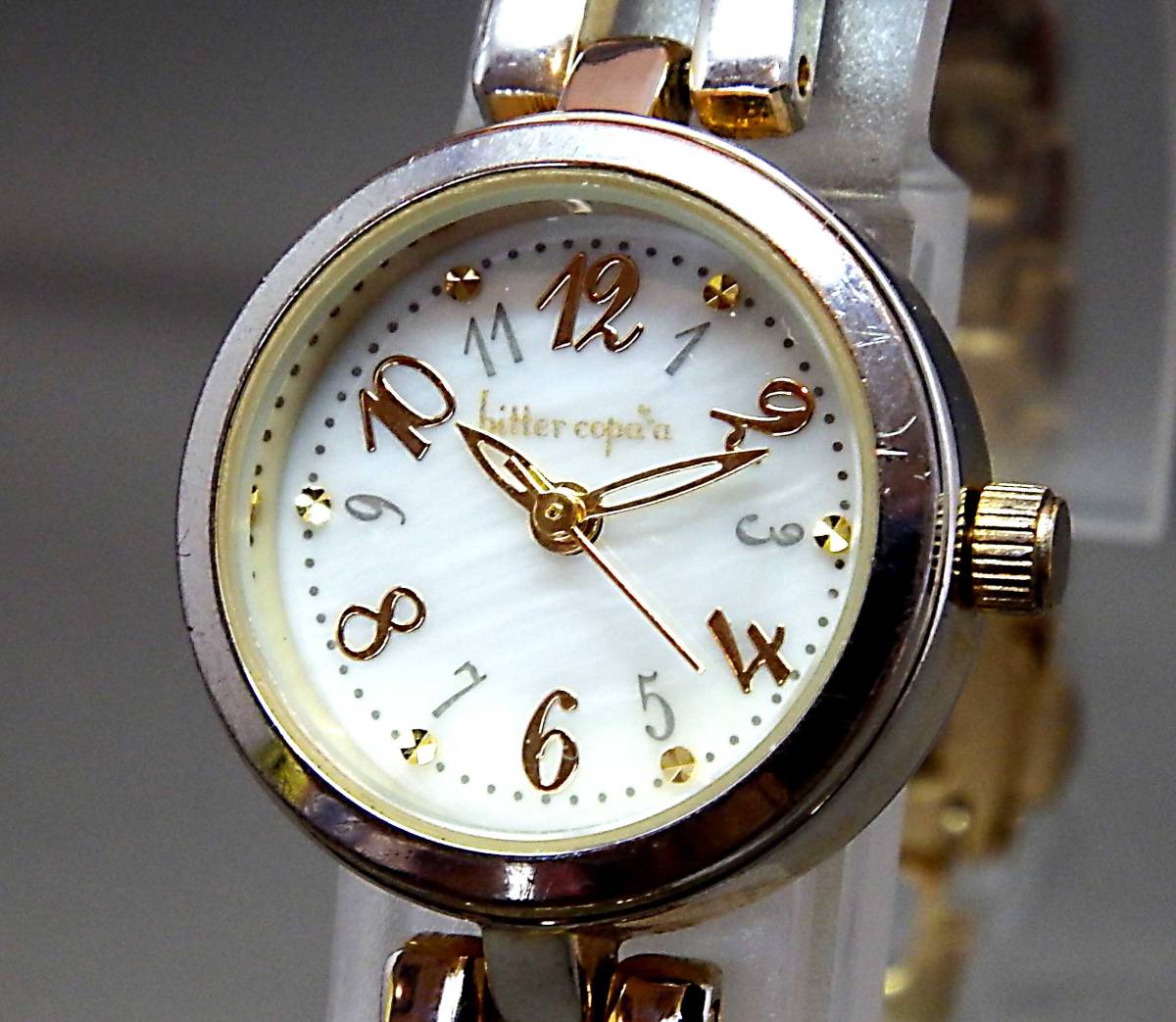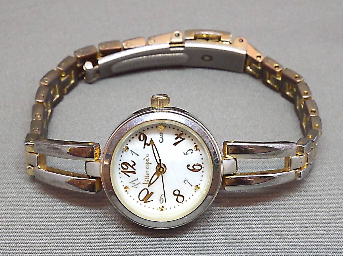 EU-0012■bitter copaa レディース腕時計 3針 丸型 中古 重さ 24g ★商品の程度はBランクです。ランクについては下記の「程度注釈」にてご確認下さい。★ ■商品説明■ USED品です。使用感あります。ガラス面・ベゼル・裏蓋・ケース・バンドには若干の小キズ・スレ・汚れがあります。特筆すべき損傷も無く、比較的良好な状態です。 ディスプレイやデジカメの特性上、実物と多少色が違うことがあります事をご了承ください。 また、バンドの腕周りは充分ご確認ください 。 ■仕 様■ ★裏蓋材質:SS ★バンド幅:約0.9cm ★腕周り:約15.5cm ★文字盤ケース 直径2.2cm ★カラー:シルバーカラー/ゴールドカラー 〔手採寸〕 ★重さ 24g ★3針 ★クォーツ 令和2年1月 動作確認済み (内) ■写真以外の付属品などはありません。 ■『クォーツ時計(電池式)』につきましては、当店では、出品時に動作確認(機能・電池切れのチェック含む)をしておりますが、電池の残量は不明です。 電池も中古ですので、保管~お客様のお手元に届くまでの期間に「電池切れ」になることもございますが、原則として、そのまま発送させていただきます。 (「電池切れ」の場合は、最寄りの時計店で、お客様負担にて電池交換していただくことになります。) 当店では、お客様に時計をお安くご提供させていただくため、 電池の新品交換費用(通常、約1,000円)は、価格に組み込んでおりませんので、 無償での電池交換はお受けできません。 この様な条件を理解された上で、ご入札をお願い致します。(ジャンク品を除く) ■あくまでも中古品扱いですので、記載以外のダメージもある場合がございます。 保存期間があったため、お手入れが必要な場合がございます。 ■直接店頭にてお品物をご覧になりたい場合には、事前に質問欄よりその旨ご連絡をお願いいたします。ご連絡をいただいていない場合にはお見せできない場合がございます。 ★程度注釈★ ●Nランク… 完全新品:箱や紙袋の有無は商品によって異なります。 ●Sランク… 展示未使用品:新品ではないが、使用感がほとんど伺えない商品です。 ●Aランク… 中古品:小キズやスレなどが若干ありますが、全体的には綺麗な商品・美品です。 ●Bランク… 中古品:一般的な中古商品。明らかな使用感があり、小キズ・スレ・汚れも目立ちますが、まだまだ充分ご使用できる商品。平たく言えば街中でよく見かけるくらいの状態です。 ●Cランク… 中古品:小キズ・スレ・汚れもかなり目立つ使い込んだ商品。状態は正直悪いですが、使用には充分耐えられ、お値打ち価格で入手できる商品。とにかく安くほしい!と言う方にオススメです。 |