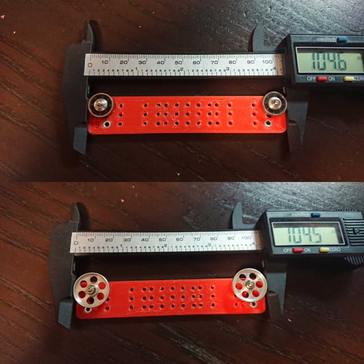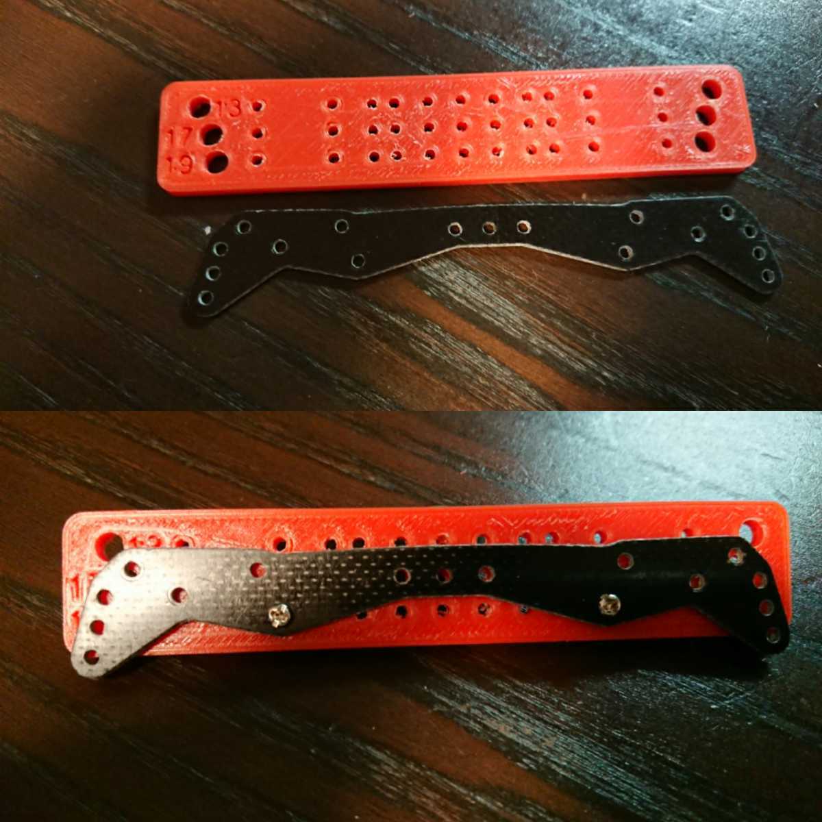 ミニ四駆のローラーの位置を、車幅104mm台まで広げて、調整するための穴位置決めプレートです。