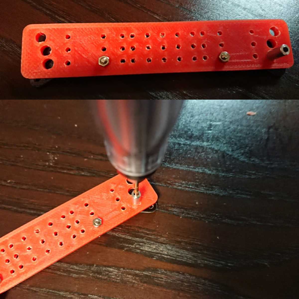 4mm穴→ミニ四駆で使う外径4mmのアルミスペーサーを垂直穴あけのガイドとして利用し、FRPやカーボンに穴を空けるための穴です。104.2~8mm位置の穴をあけることができます。