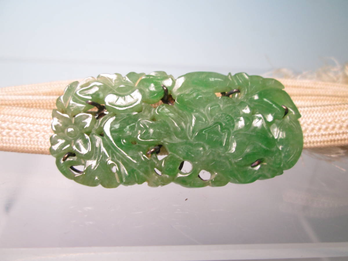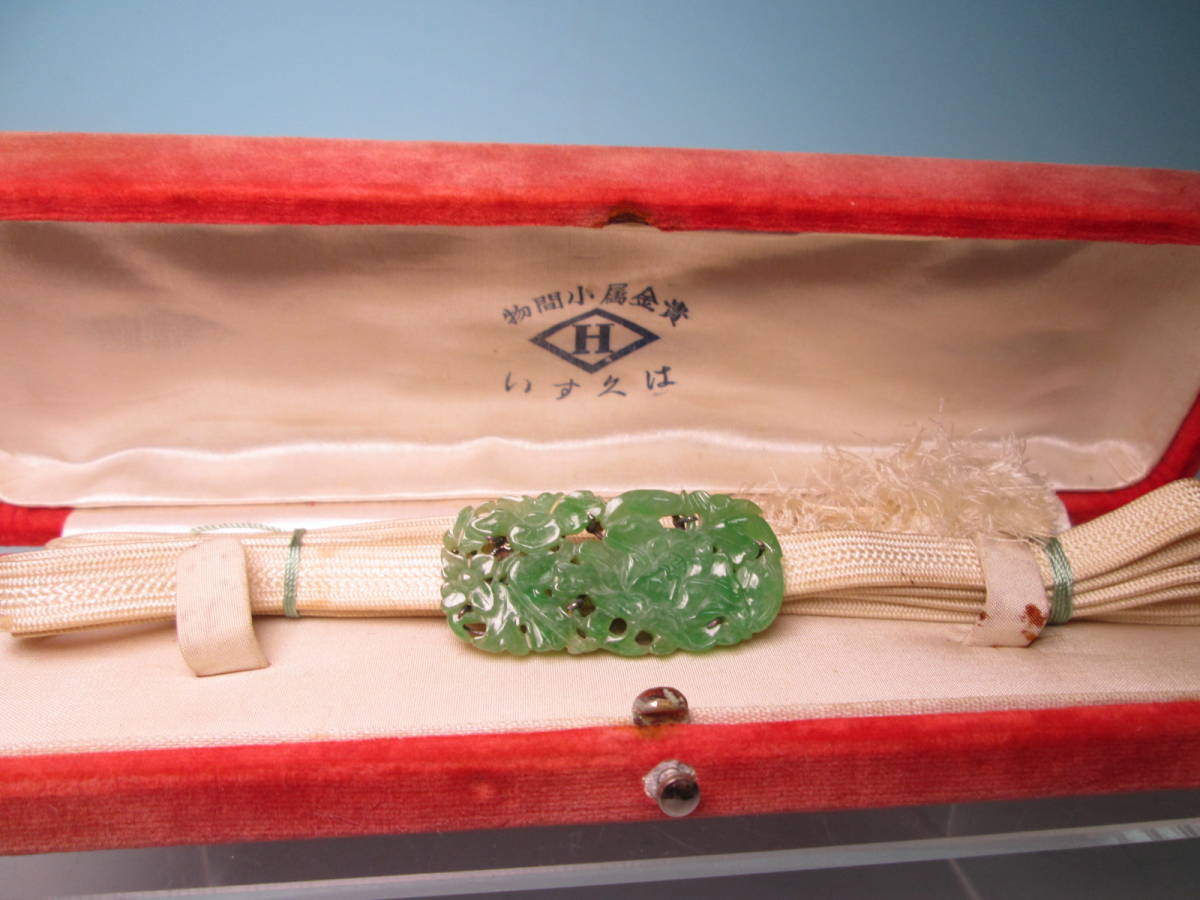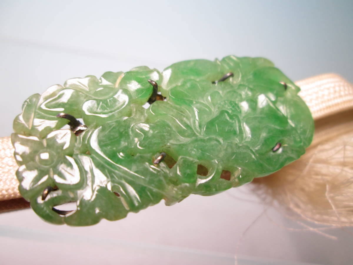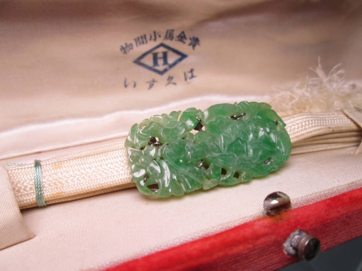 【江月】アンティーク・は久すい 本翡翠 牡丹の花透かし彫刻の帯留め 共ケース付