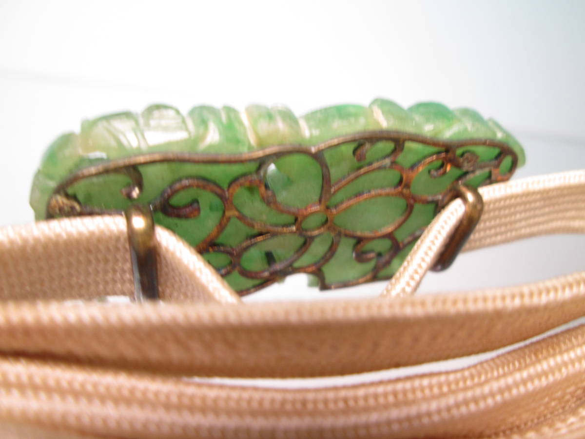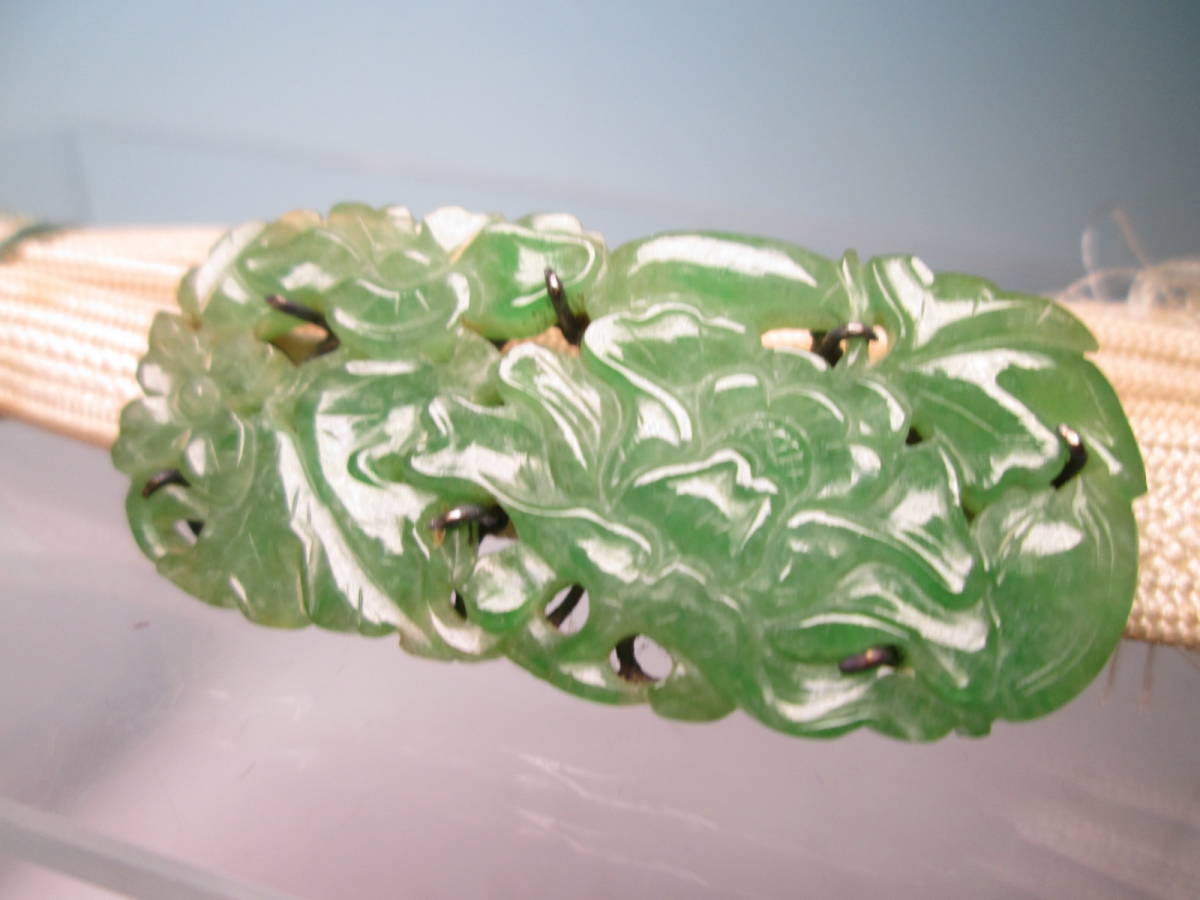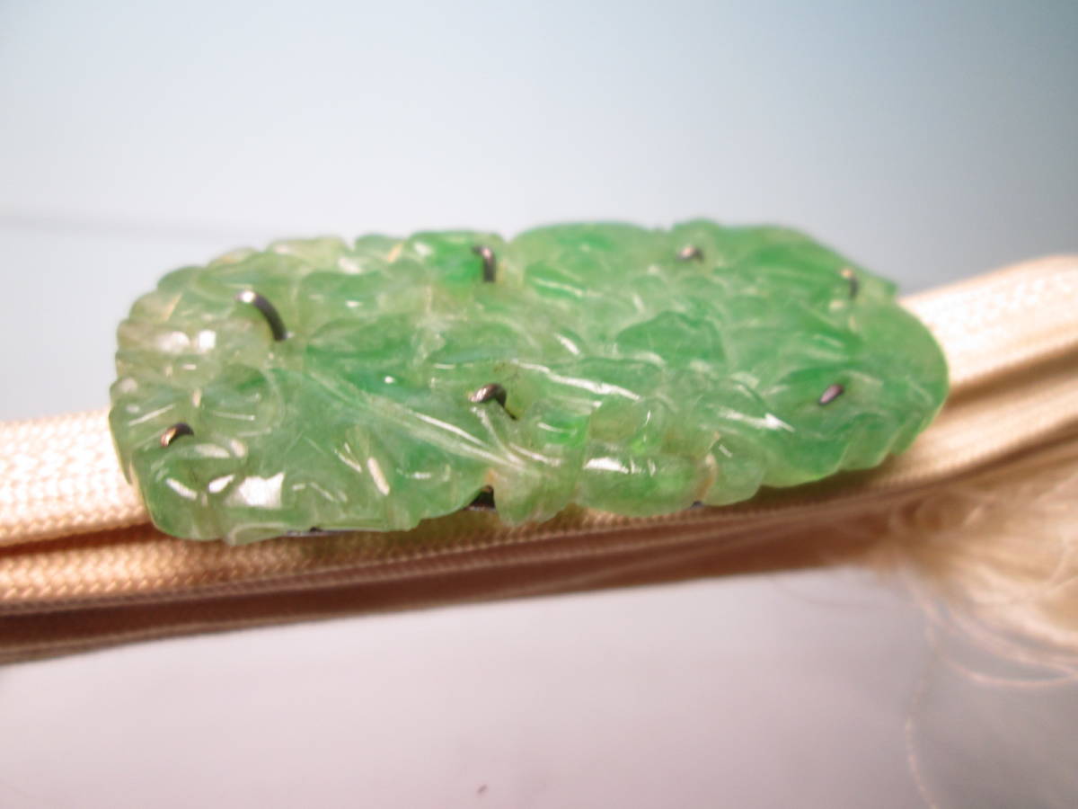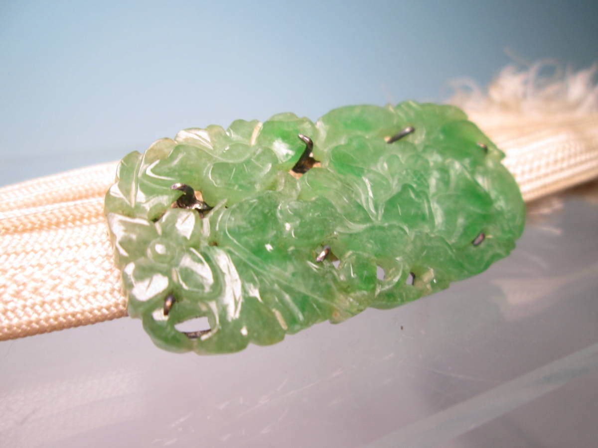 【江月】アンティーク・は久すい 本翡翠 牡丹の花透かし彫刻の帯留め 共ケース付