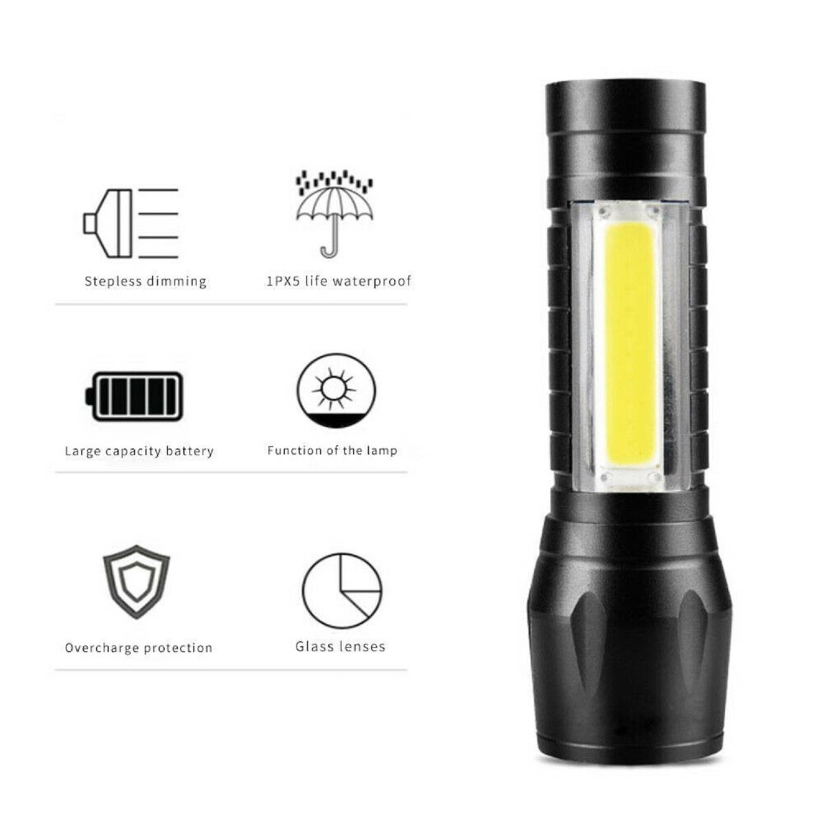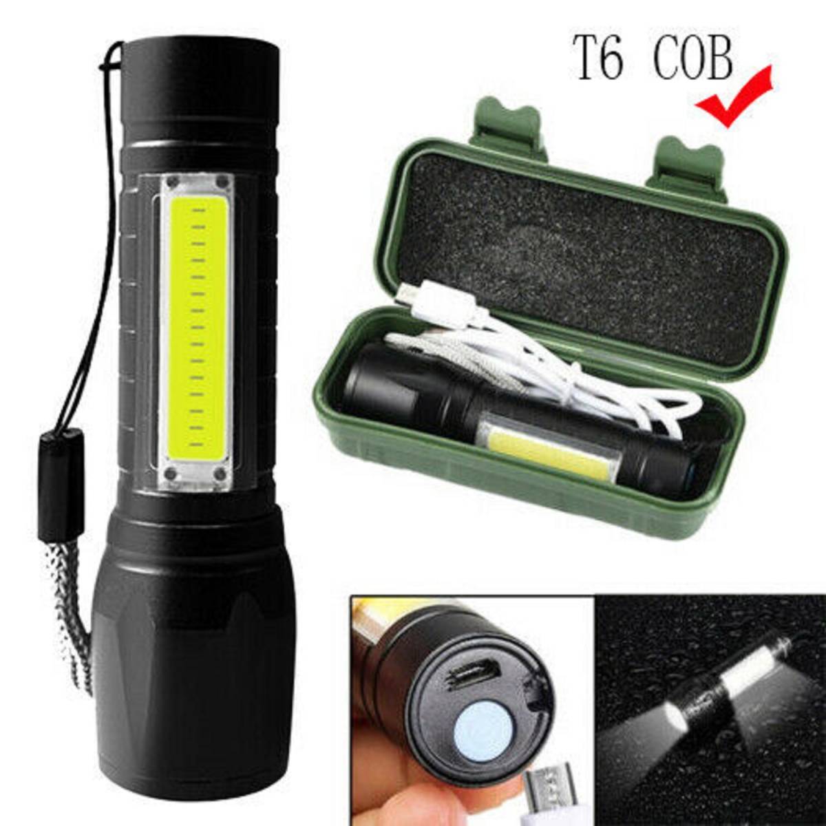 | ポータブルT6 COB LEDタクティカルUSB充電式ズーム可能懐中電灯トーチランプ | |