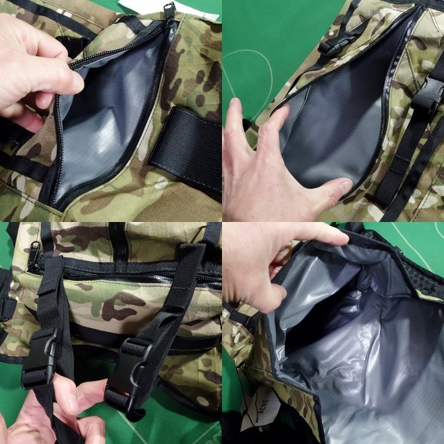 メイン収納部口はフラップバックル止めとロールトップベルクロ止めの2WAY。内部にはポケット等はありません。