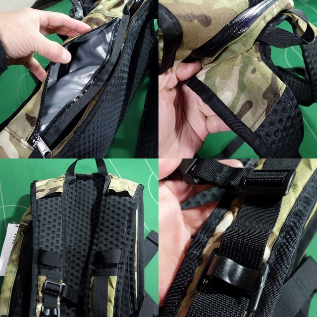 メイン素材には防水で引き裂き強度に優れ、とても軽量なX-PACナイロンを使用し、バッグは2層構造で背中側がハイドレーションパックコンパートメントになっています。
