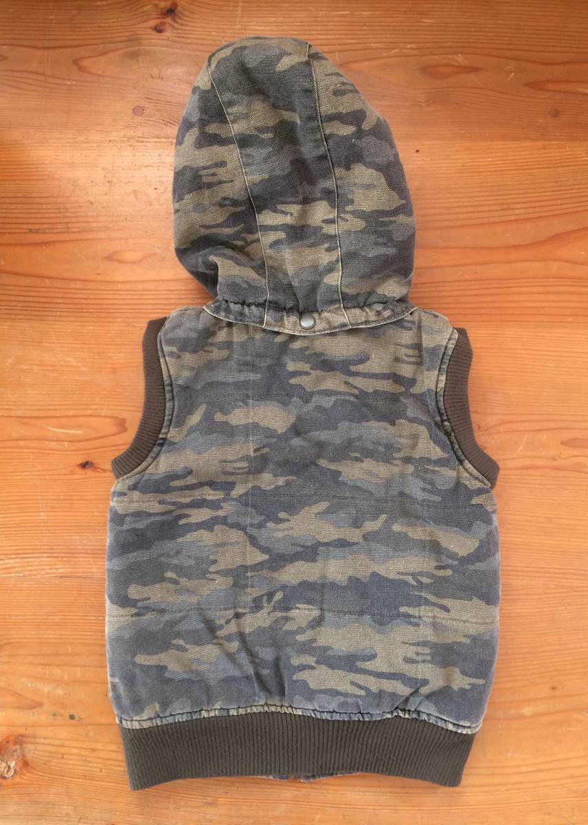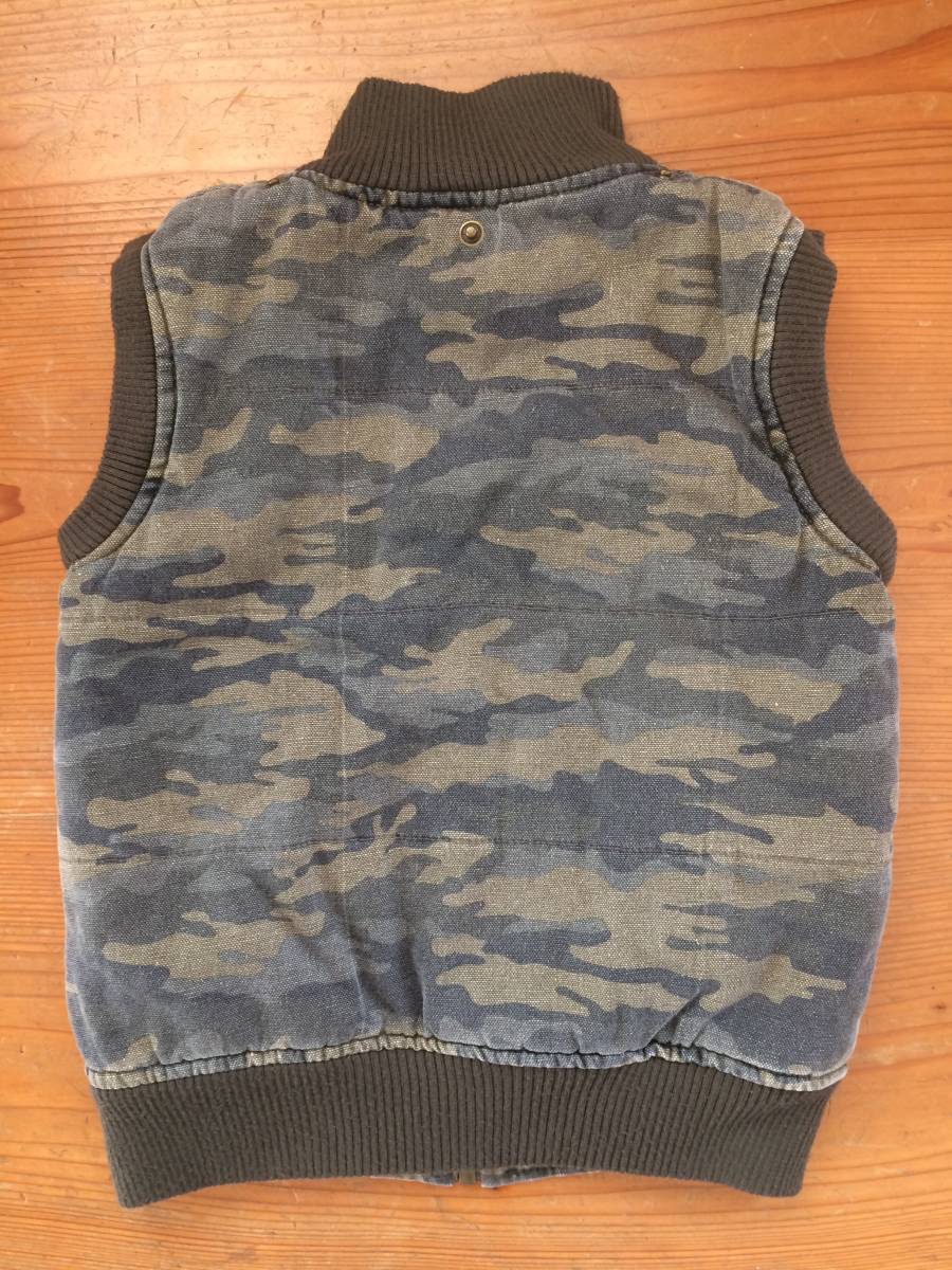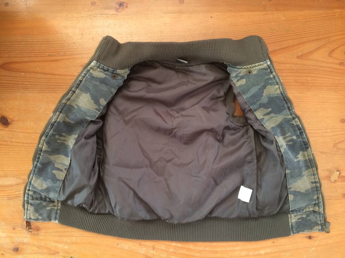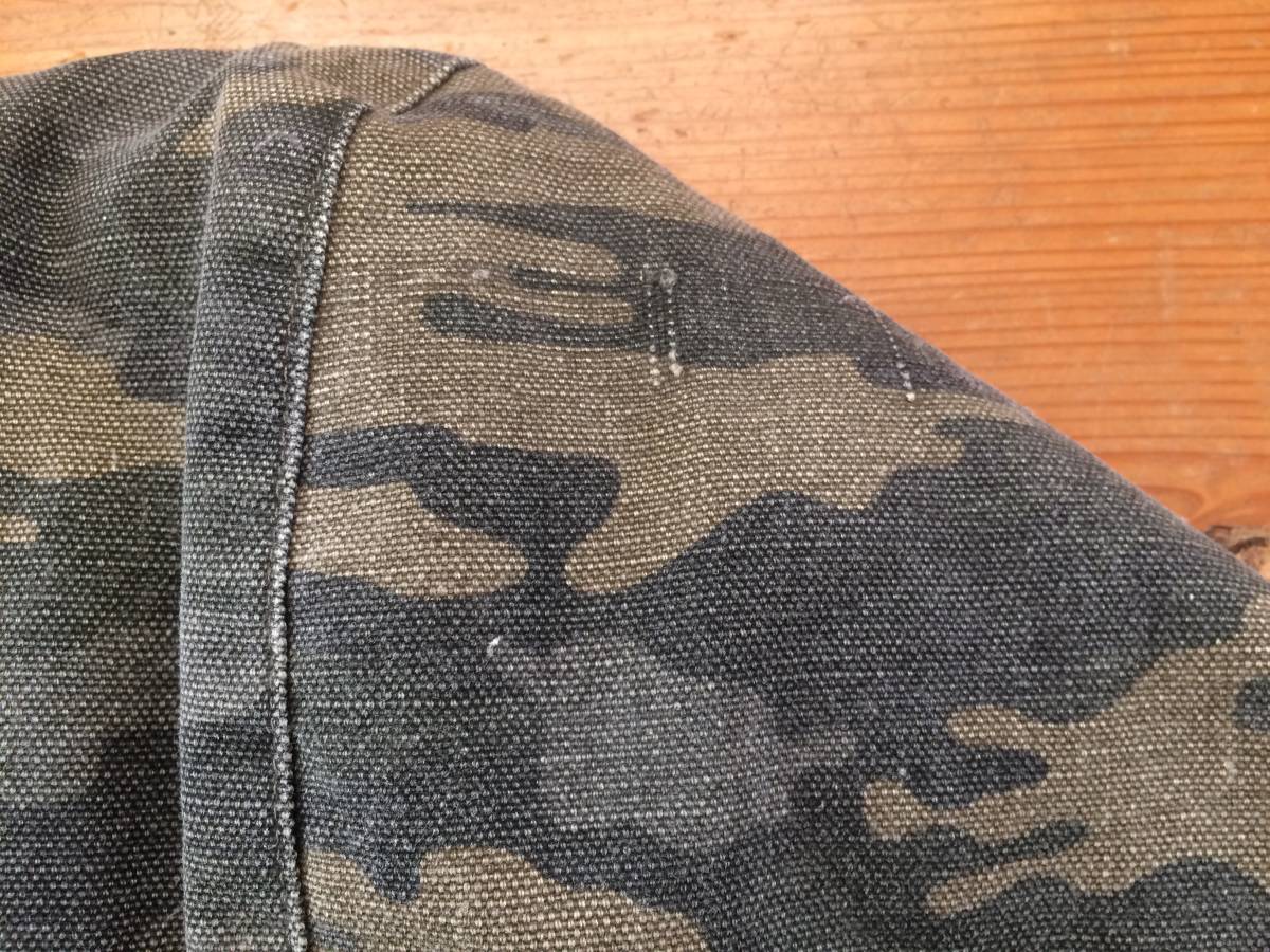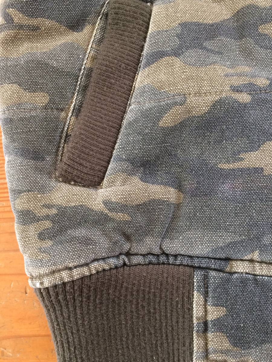 薄めの迷彩で、生地はキャンバスのような少し厚手の生地です。リブに少し毛玉が、できています。前側 右ポケットリブとファスナーの間に、白っぽい汚れがあります。(8枚目写真参照)