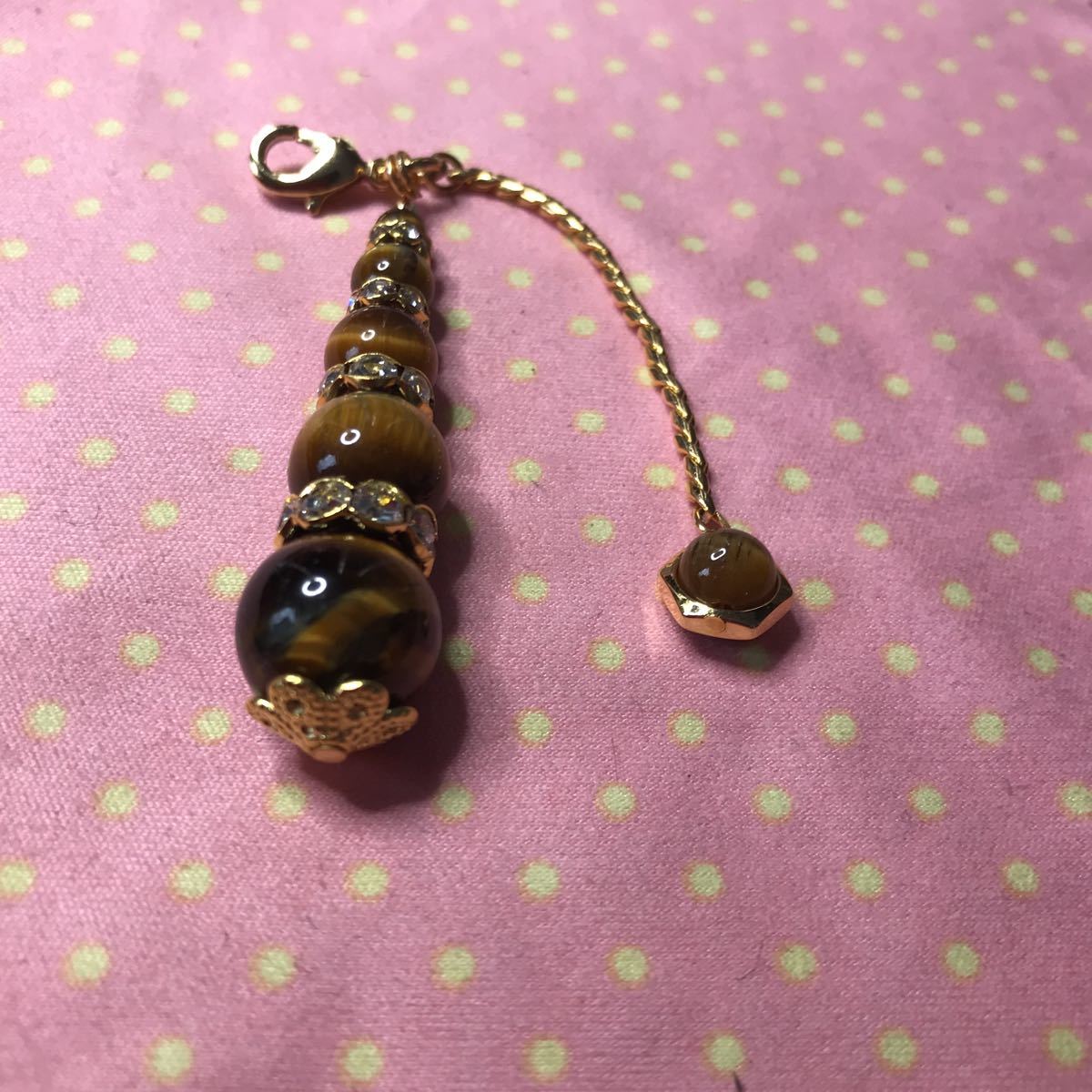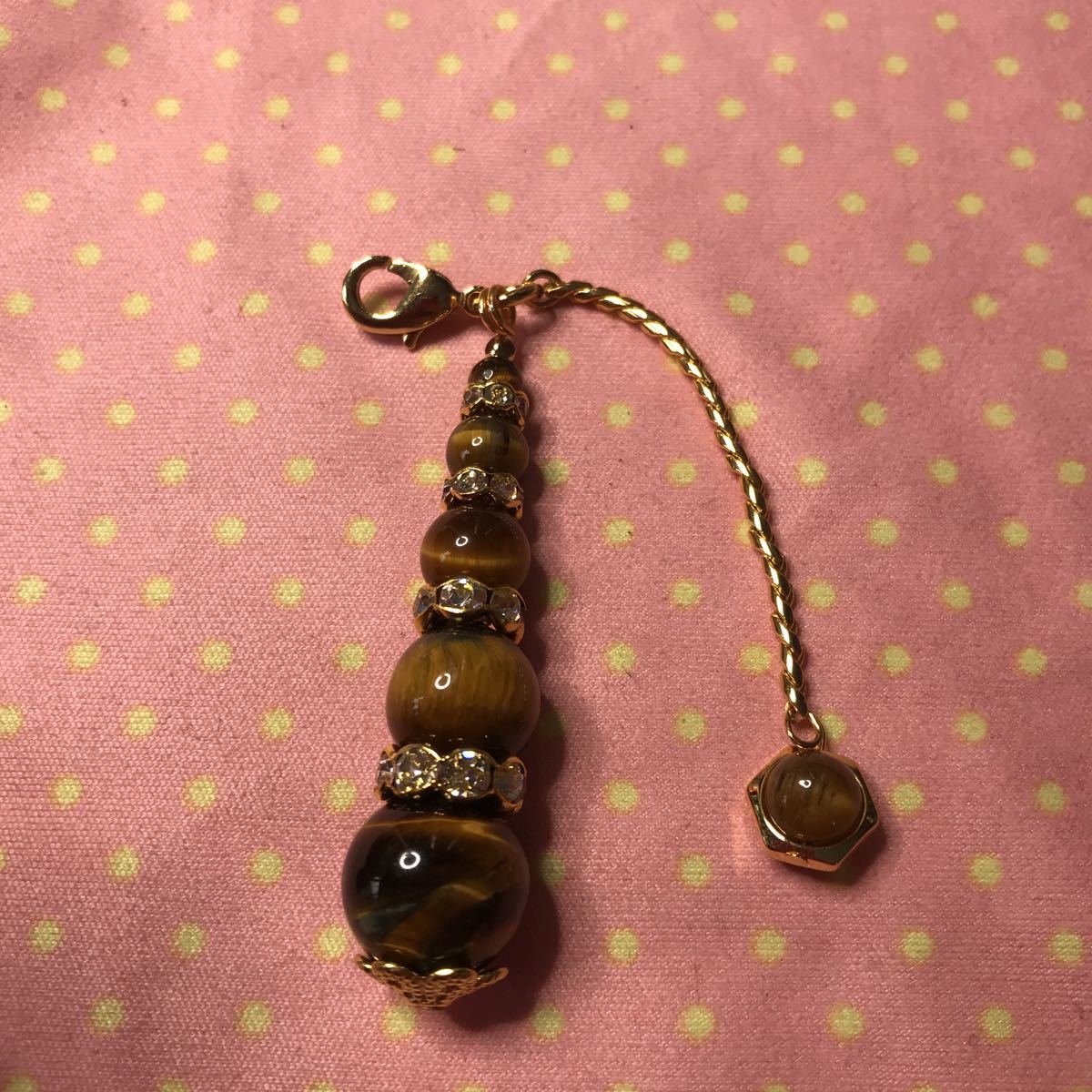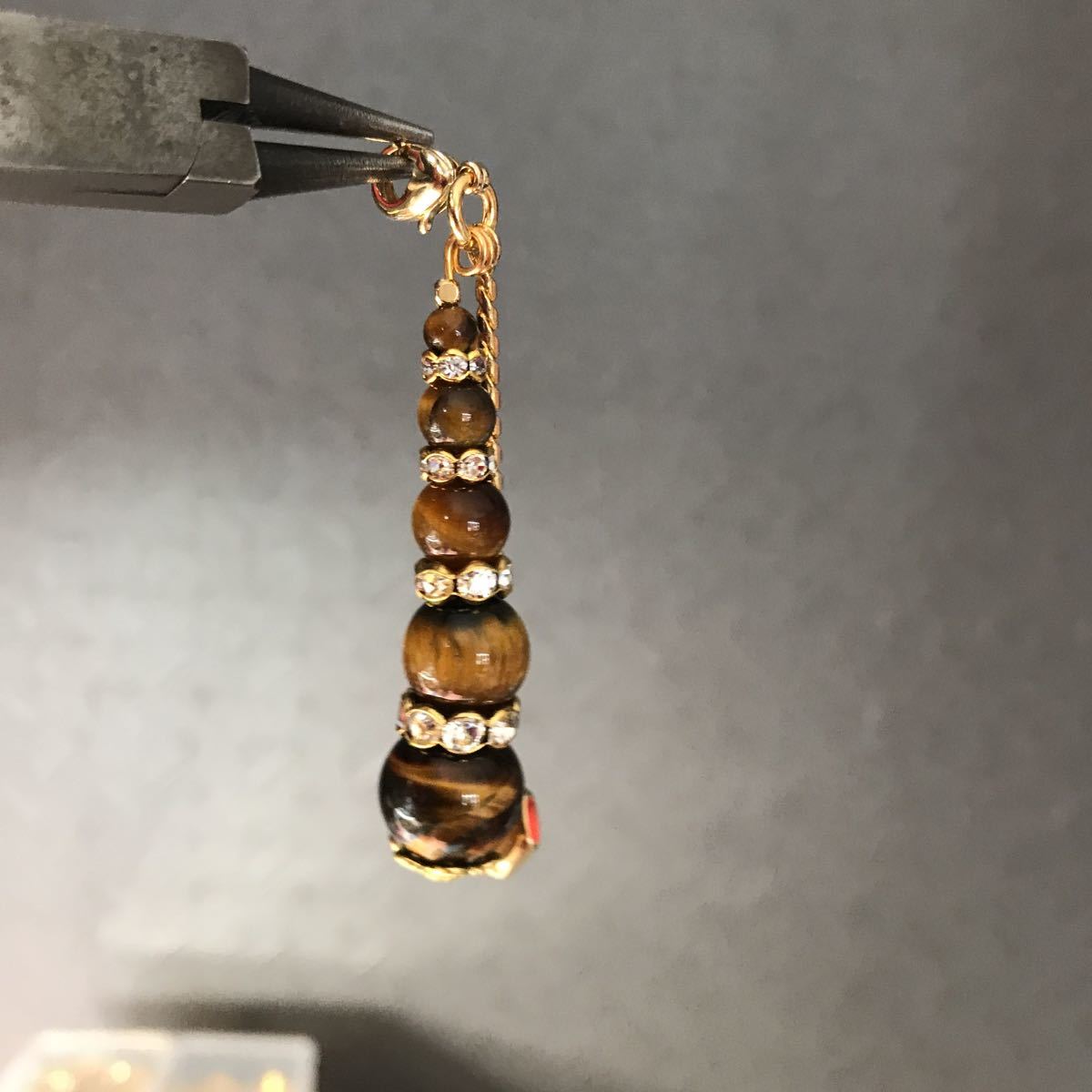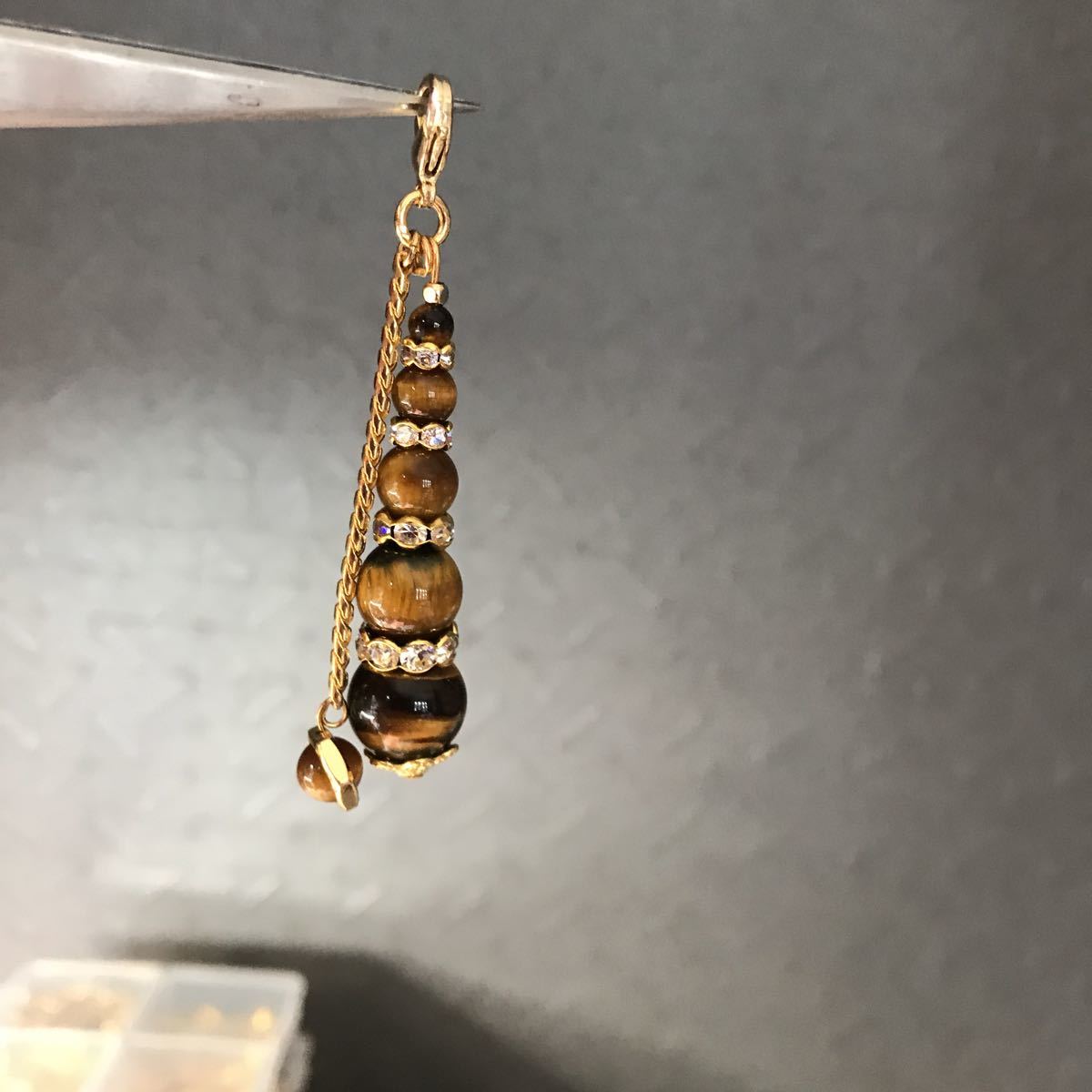 タイガーアイは12ミリ10ミリ8ミリ6ミリ4ミリ使用しております,間にキラキラロンデル挟みとても素敵な仕上がりです、タイガーアイは仕事運金運上がると言われる石ですのでバッグや財布やスマホなどにお使いください