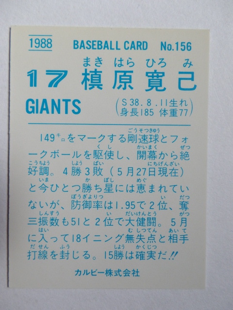 カルビー プロ野球カード 1988 No.156 槙原寛己 読売巨人 ジャイアンツ