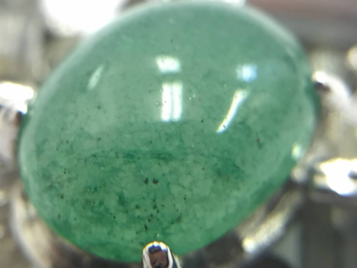 アベンチュリンや翡翠のような色合いの飾りが付いています。 ダイヤのような透明ストーンがキラリと光り、高級感を出しています。上品でアンティークなデザインが素敵です。