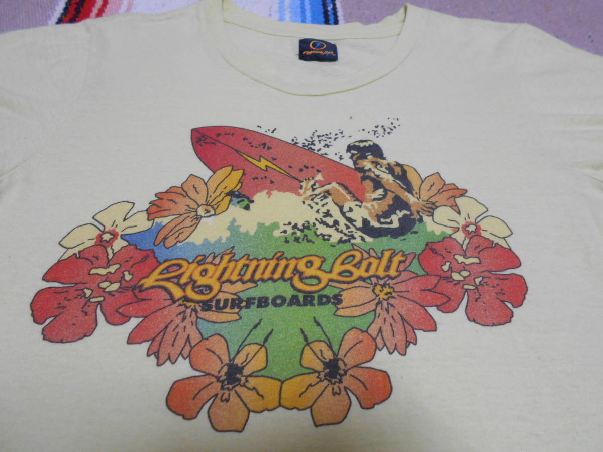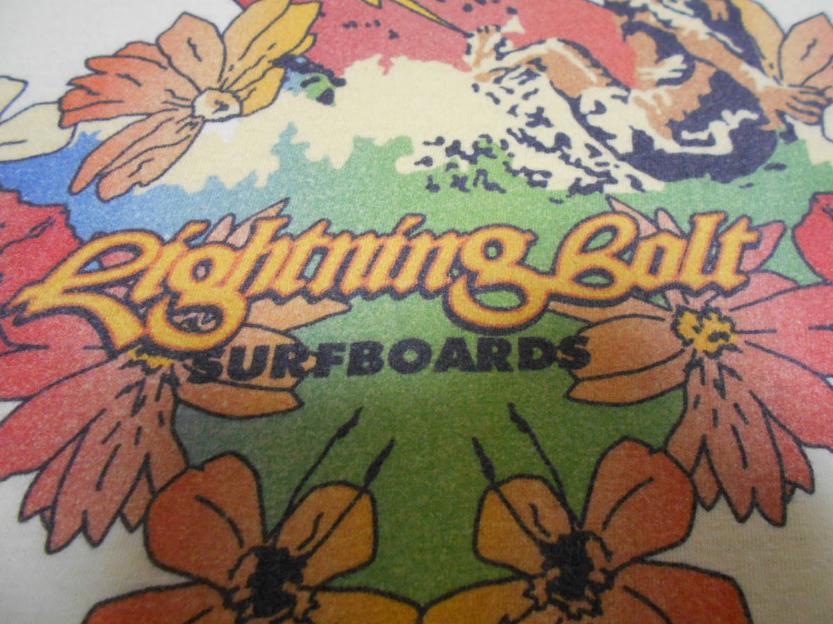 インパクト有るマルチカラー、Lightning Bolt オリジナルロゴ,、トロピカルなハイビスカスのレイ、稲妻ディケールのボードでオフザリップをかますサーファーのグラフィック   等等...拘りあるディテールが半端ではなく良い感じ
