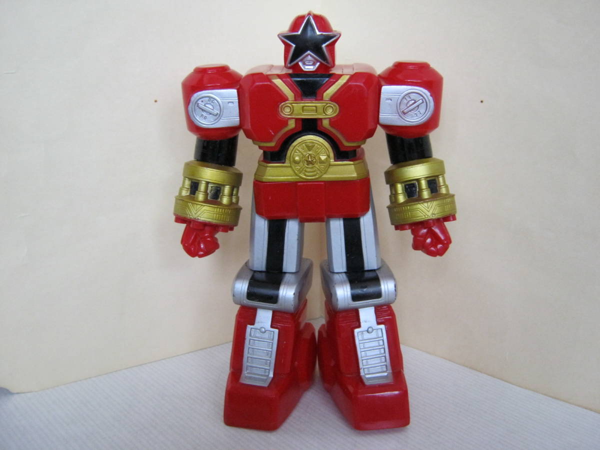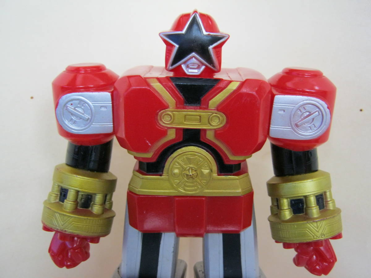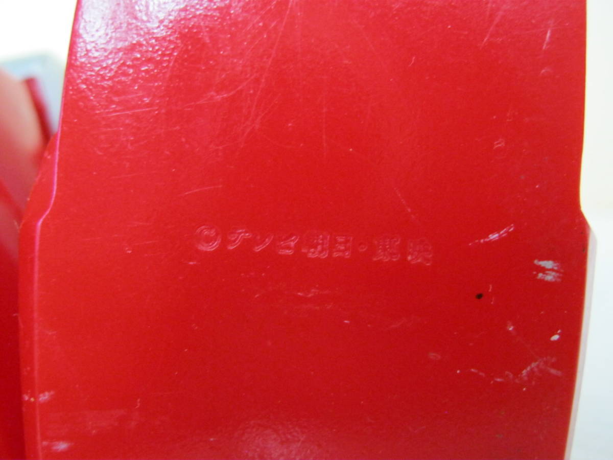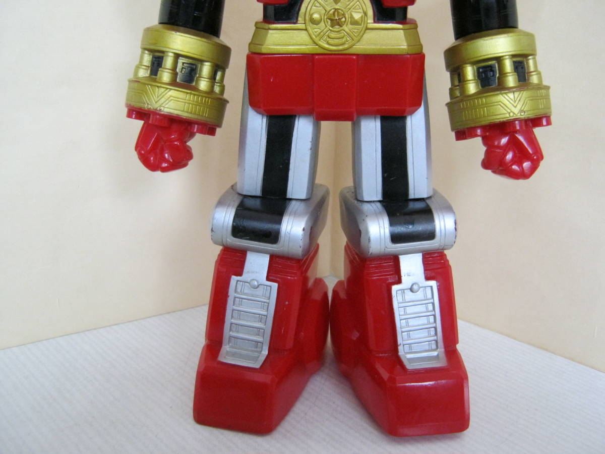 当時物、本体のみです。本体に汚れ、キズ、スレ、色ハゲがあります。破損、欠品はありません。サイズは約22.5㎝位です。本体の左右の腕を上げ下げできます。左右の肘から手の部分まで回転させることができます。左右の足のヒザから外側に開くことができます。左右の足の底面に刻印があります。刻印は左足の底面には丸の中にCの文字テレビ朝日・東映 右足の底面にはBANDAI 1995 MADE IN JAPAN(日本製)以上の刻印があります。
