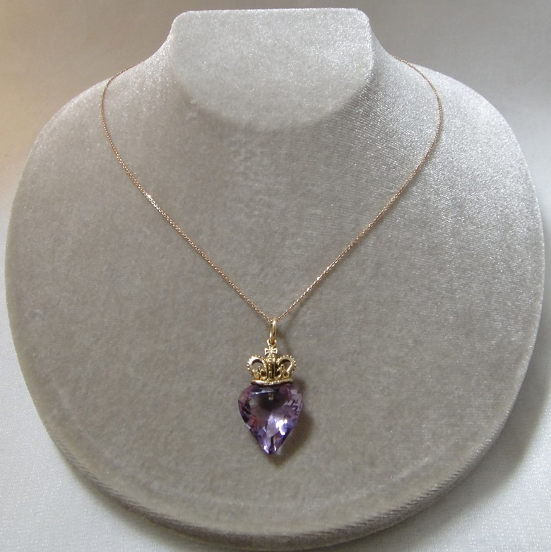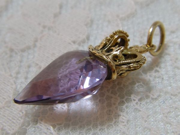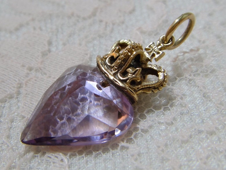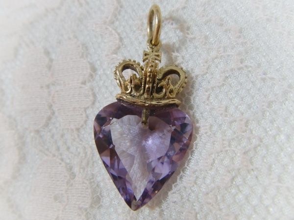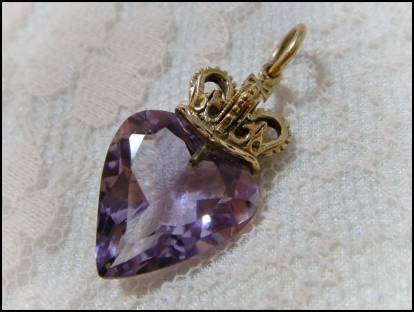 アンティーク K14テスト済み 天然アメジストの王冠とハートのペンダントチャーム