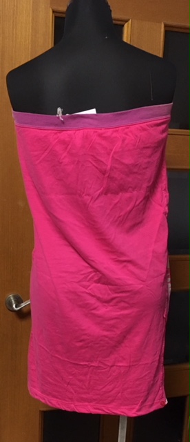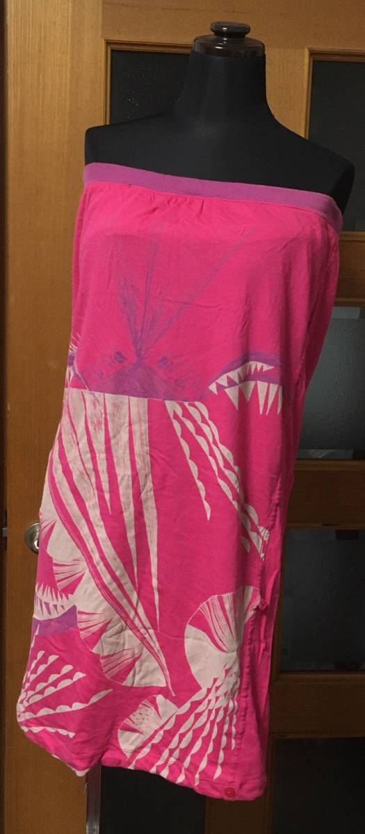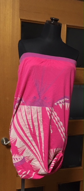 落ち着いた暗めのパッションピンク色に、ベージュと薄紫色のプリントが前面に入ったベアトップワンピースです!!