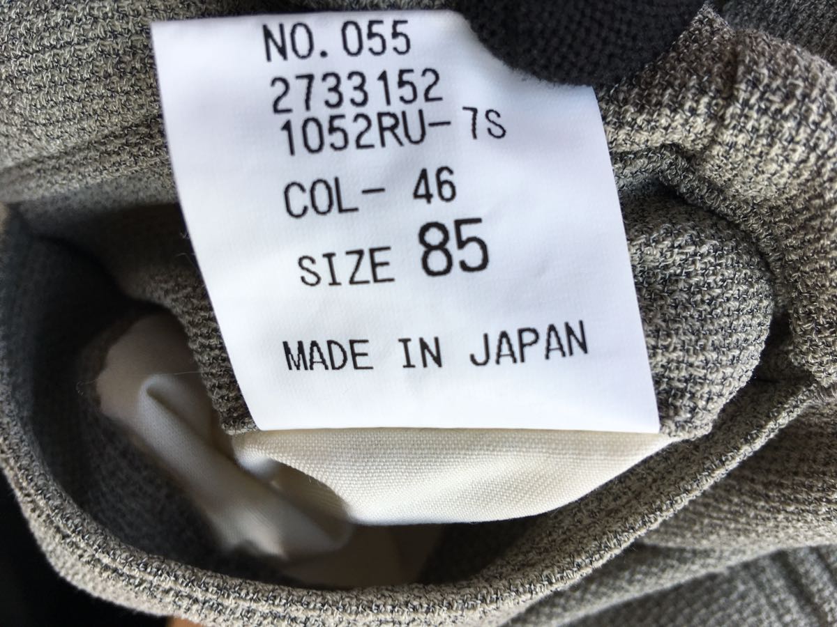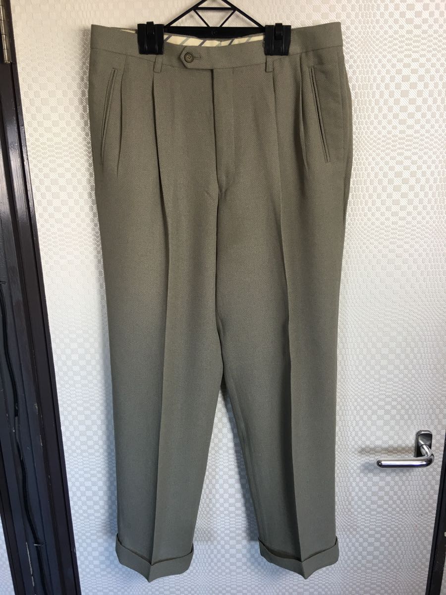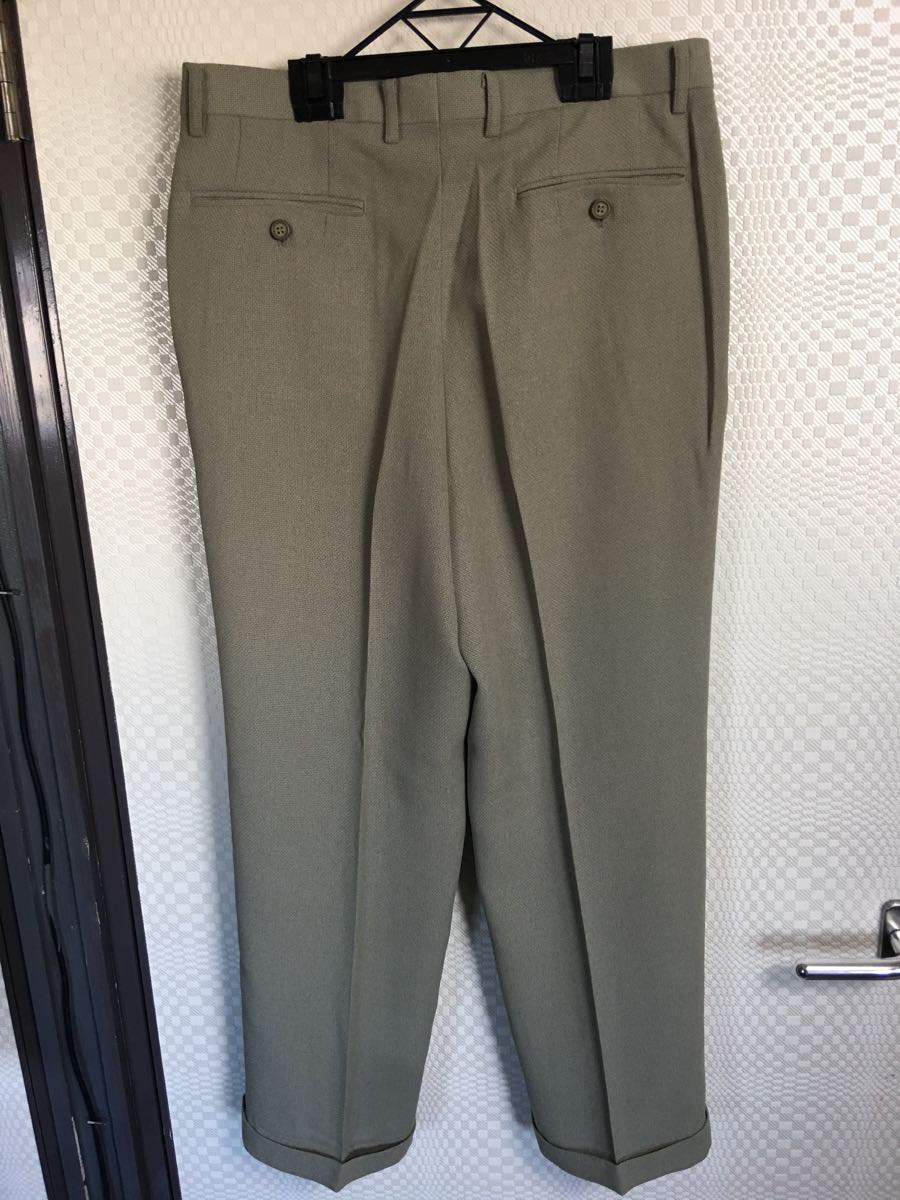 レナウンのポリエステル100%のパンツです。サイズはウエスト85股下73裾幅23センチ位で、裾はダブルになっています。