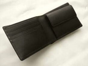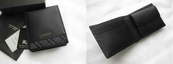 バーバリーブラックレーベルらしく洗練且つ上品、ブラックレザータータンチェック加工メタルプレー 財布