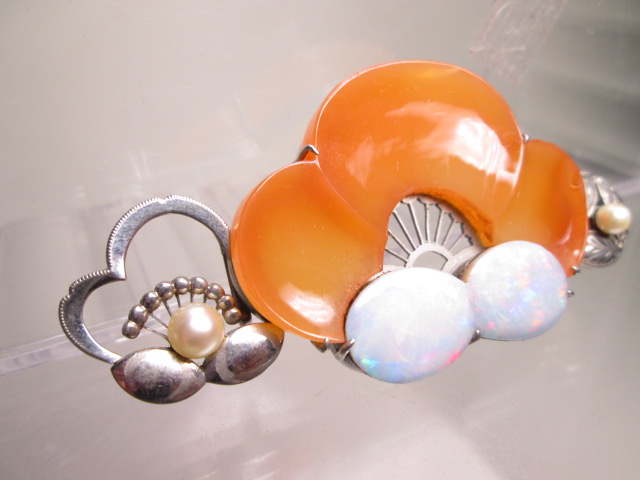 古い芝翫香の共ケース付です。梅の花にオパールとメノウをあしらい彫金細工を施した素晴らしい帯留めです。大振りで両脇の梅花には真珠が飾られ、丁寧な彫金の模様が彫刻されています。オパールの裏にはオニキスが重ねられています。刻印は有りませんが「SPM」です。