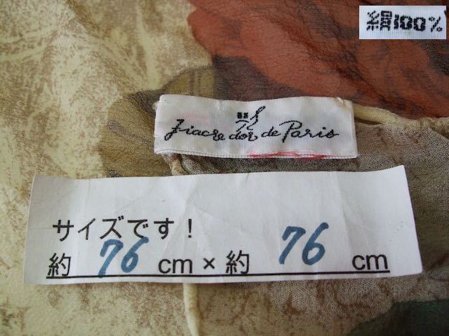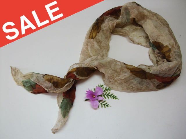 (^_^)絶品/大判スカーフ/フランス/フレンチ/花柄/茶色/シルク/絹/緑/シースルー/W6