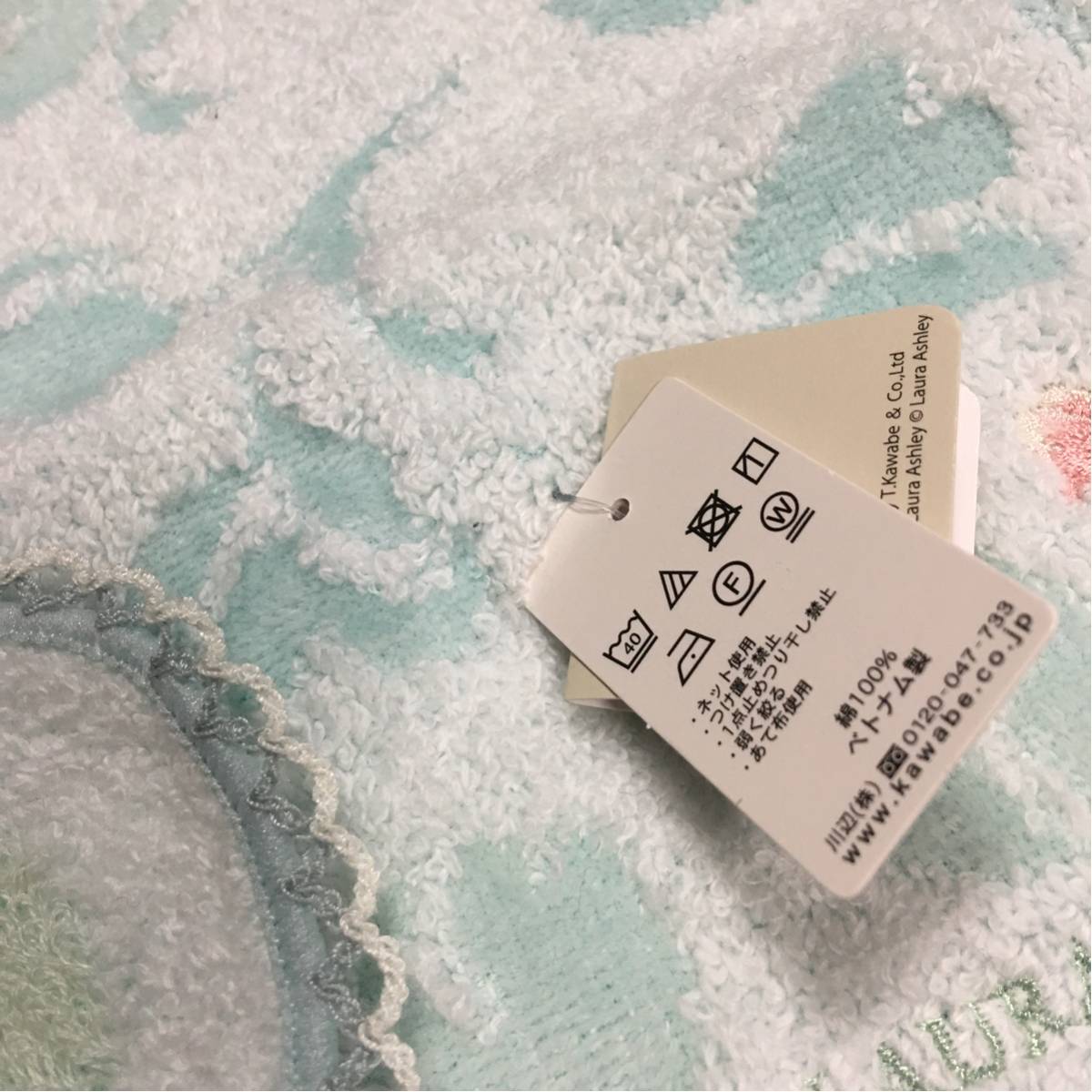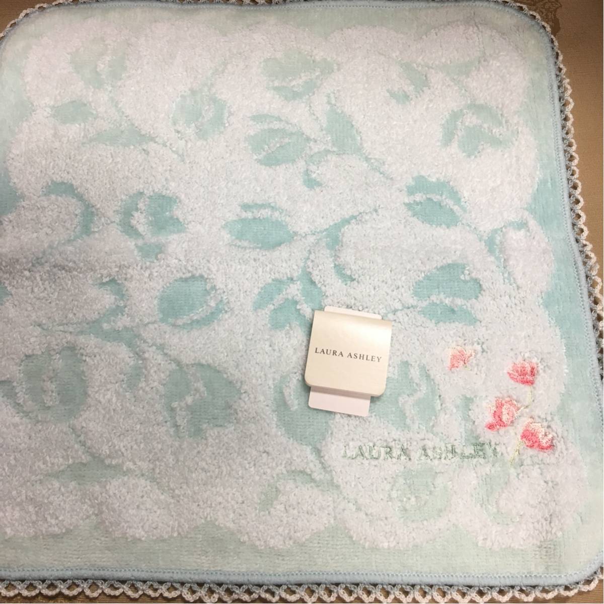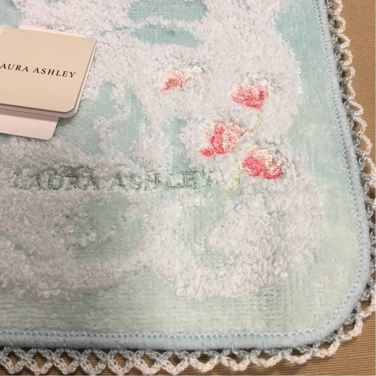 ローラアシュレイ タオルハンカチ 薔薇刺繍 レース縁 ミントグリーン系 未使用