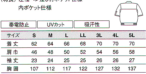 ■特徴・・・左袖ペン差し付ポケット仕様、帯電防止素材使用、形態安定性、UVカット