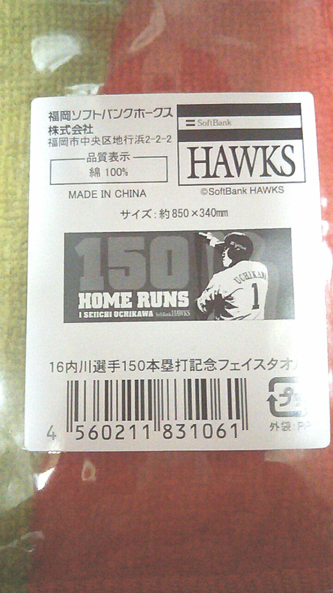 福岡ソフトバンクホークスの内川聖一選手の150本塁打記念のフェイスタオルです。