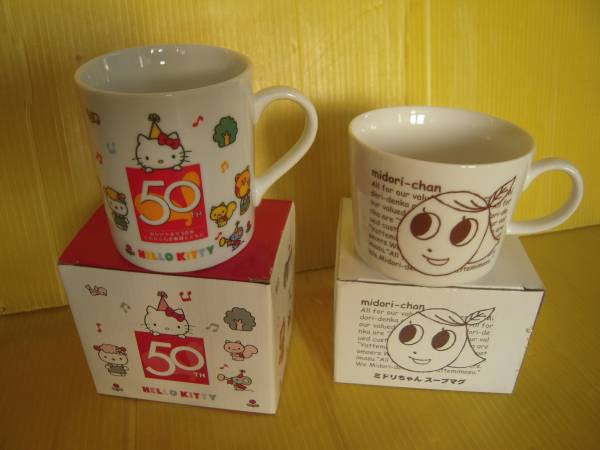 非売品 未使用 ハローキティ 50TH マグカップ+midorichan スープマグ 合計2個 箱入り 美品 レア アンティーク ★在庫処分 箱入り