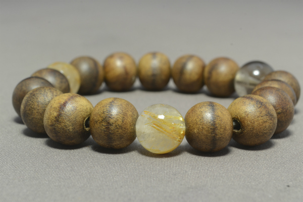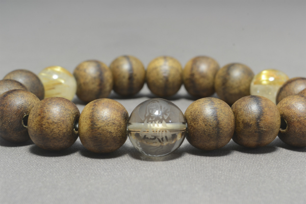 | 商品説明 | 沈香 約 11.5mm 15粒 ゴールドルチル 約 11mm 2粒 茶水晶 約 12.5mm 1粒 内周 約 16.2cm |