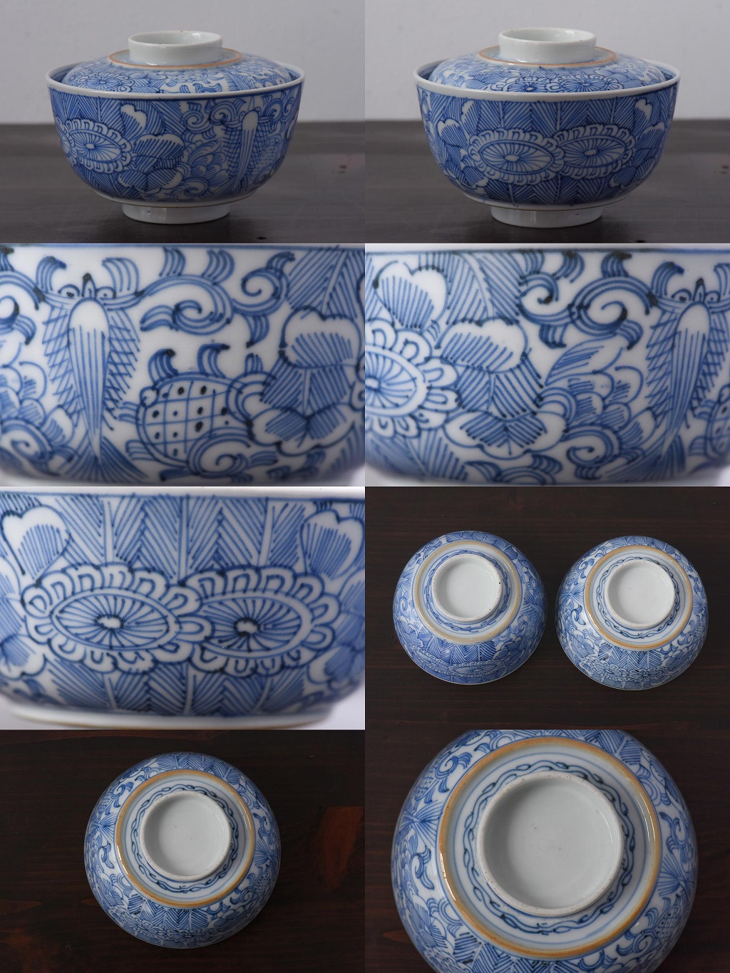 古民具・骨董 幕末明治期 線描染付 細かな図柄が味わい深い蓋付茶碗(和食器)2客セット(2)