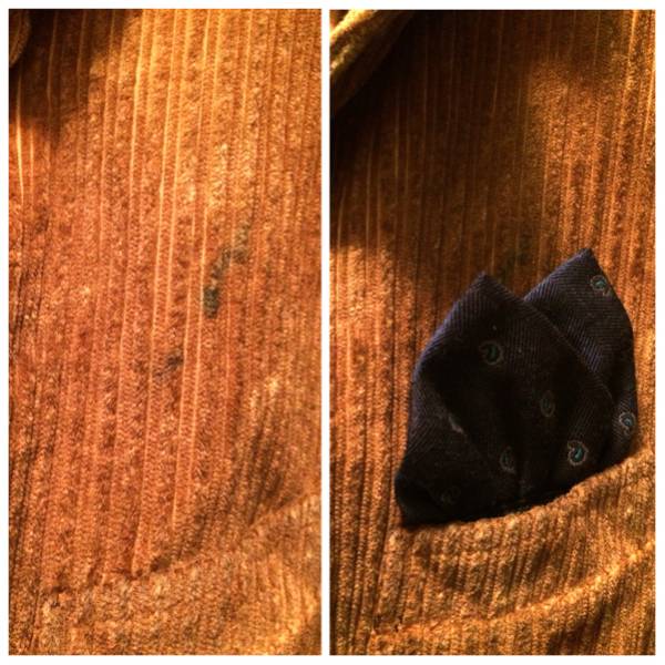 入手当時からのものですが、写真の様にチーフなどさして頂くとごまかせるかと存じますので、ドレス仕様でお召し予定の方や神経質な方には向かないかと存じます。