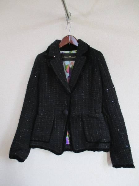 | 商品紹介 | 黒地にゴールドのラメが混ざったニット素材のジャケットです。 全体にちりばめられたスパンコールがオシャレです。 縁にはベロアの別布がポイントで付いています。 着用時には見えませんが、裏地は水色の地色に紫やピンク等の 水彩画風花柄の生地が使われています。 《素材》 表地:毛65% アクリル15% レーヨン10% ポリエステル5% ナイロン5% 裏地:ポリエステル100% |