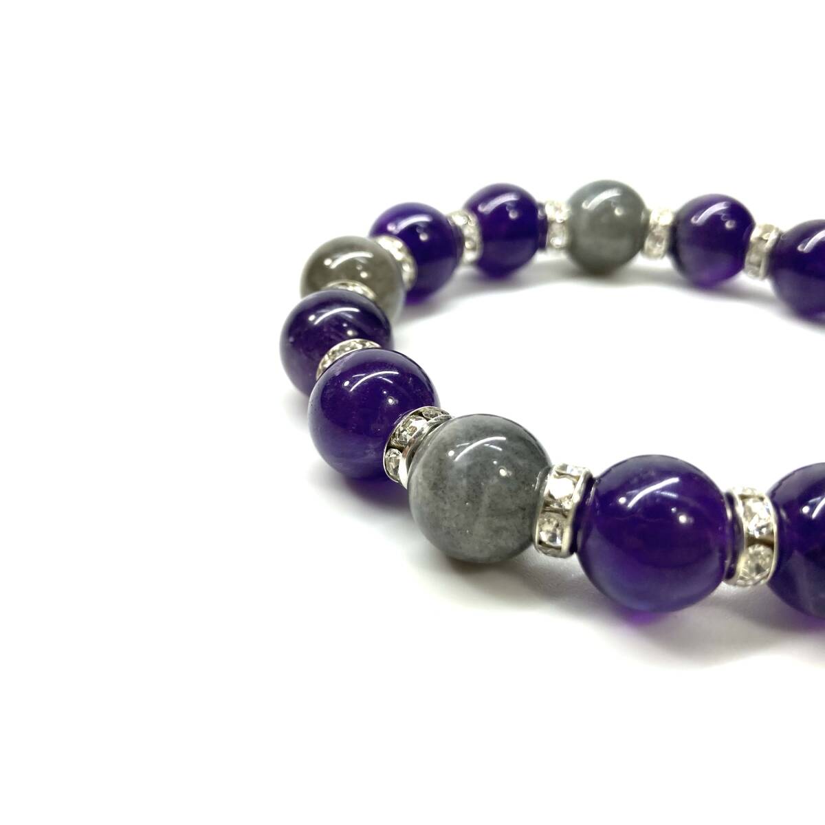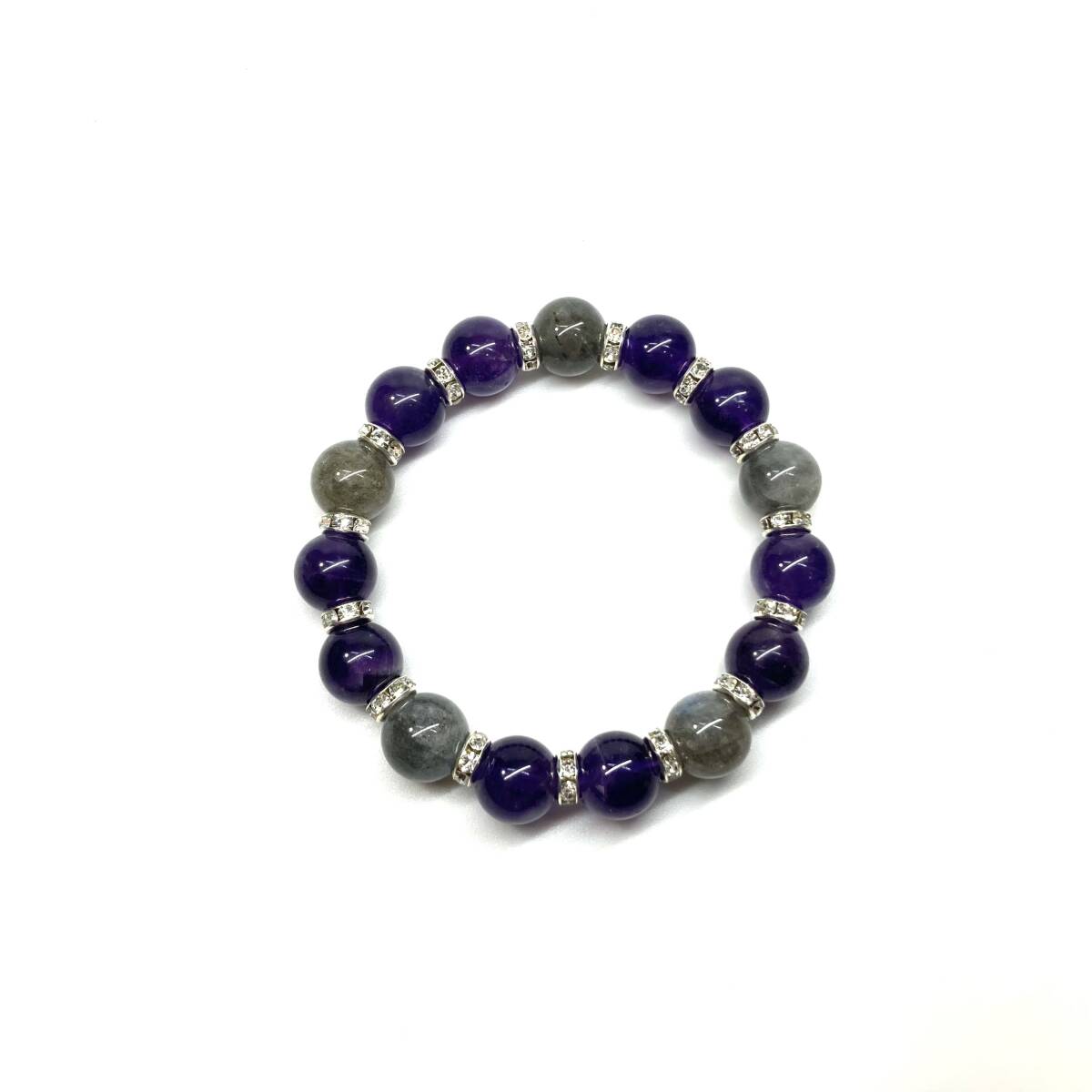 こちらは、ラブラドライトとアメジストを組み合わせたパワーストーンブレスレットです。間にはロンデルを挟み高級感あるデザインに仕上げております。石大きさは12mm玉を使用して内周約18cmです。気になる方は是非この機会にどうぞ。