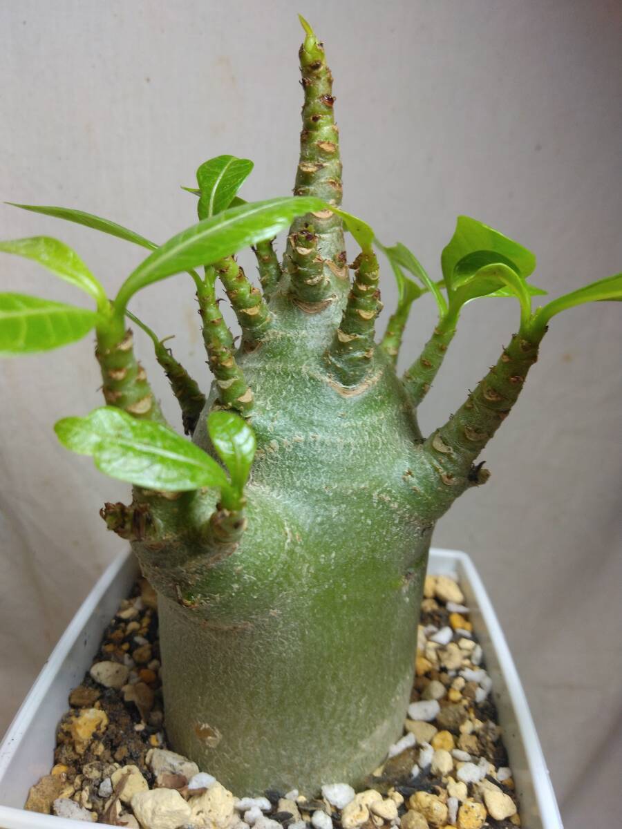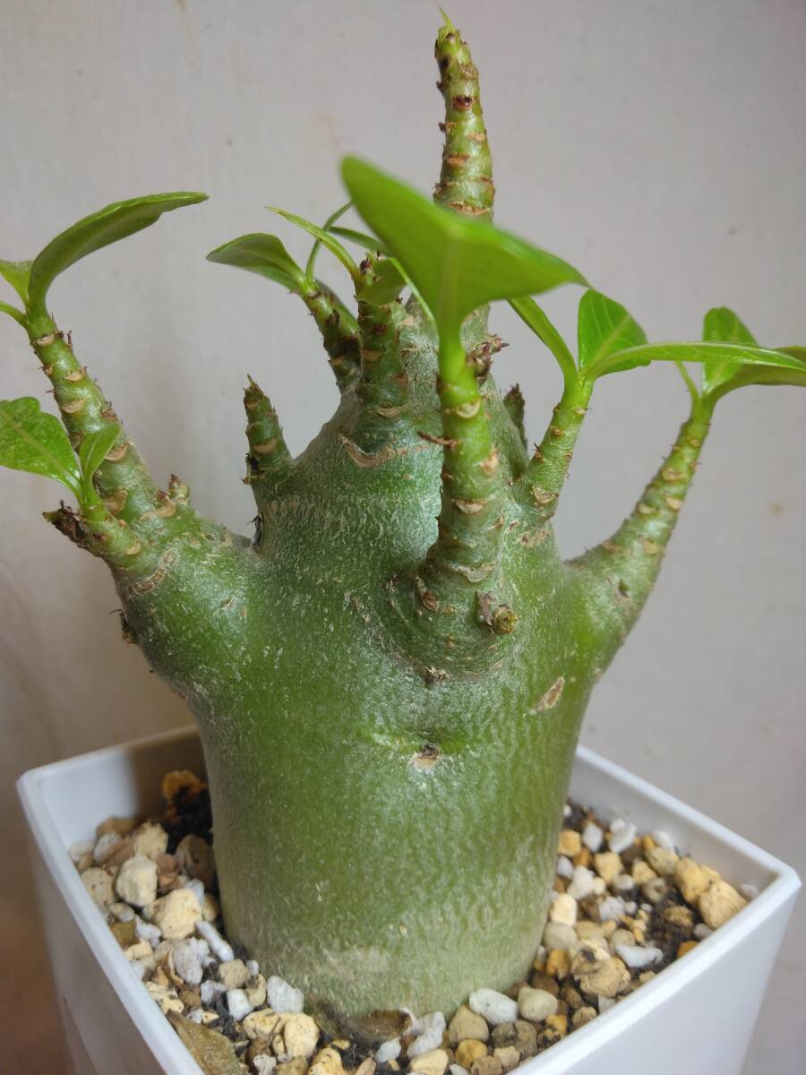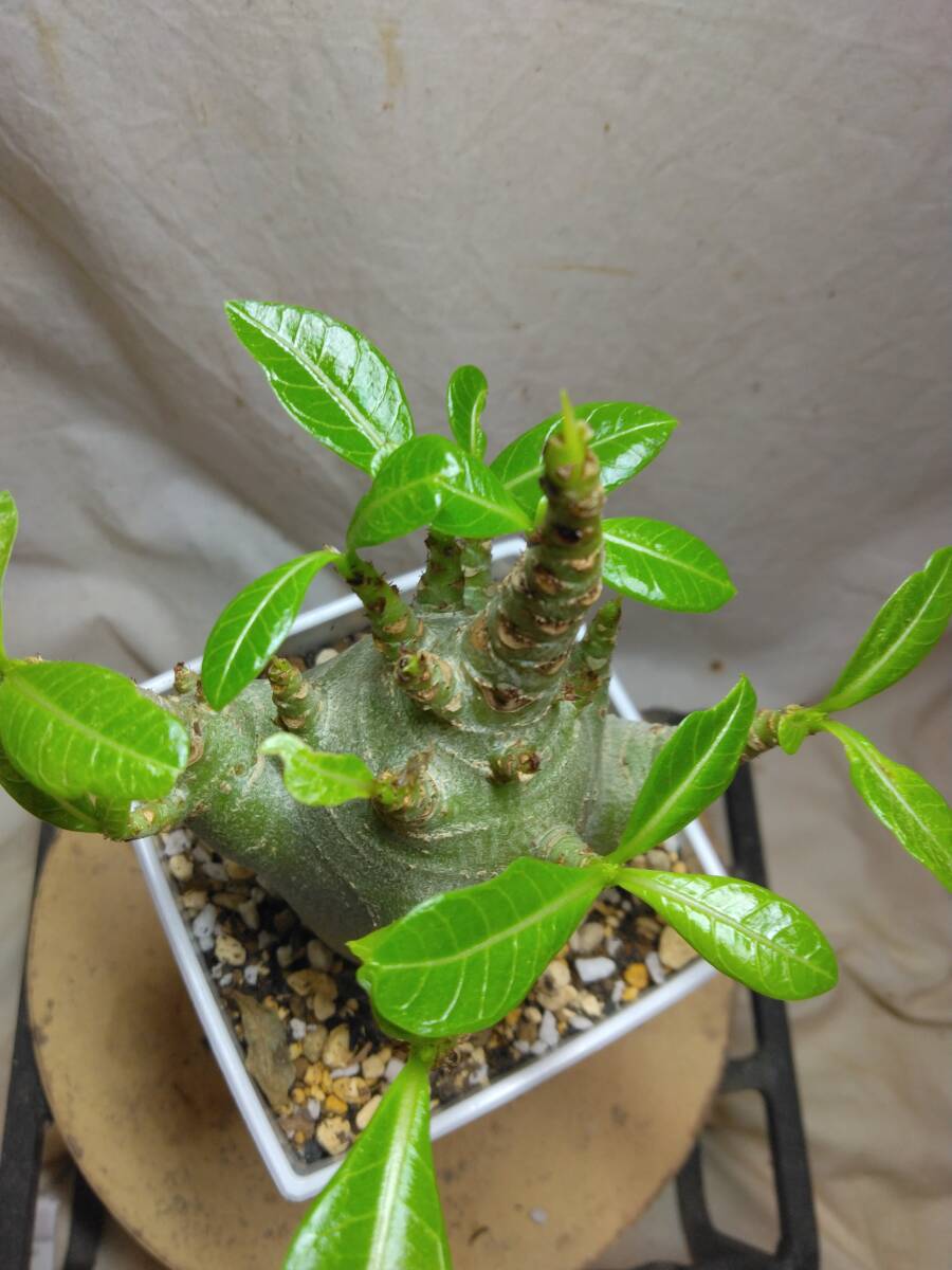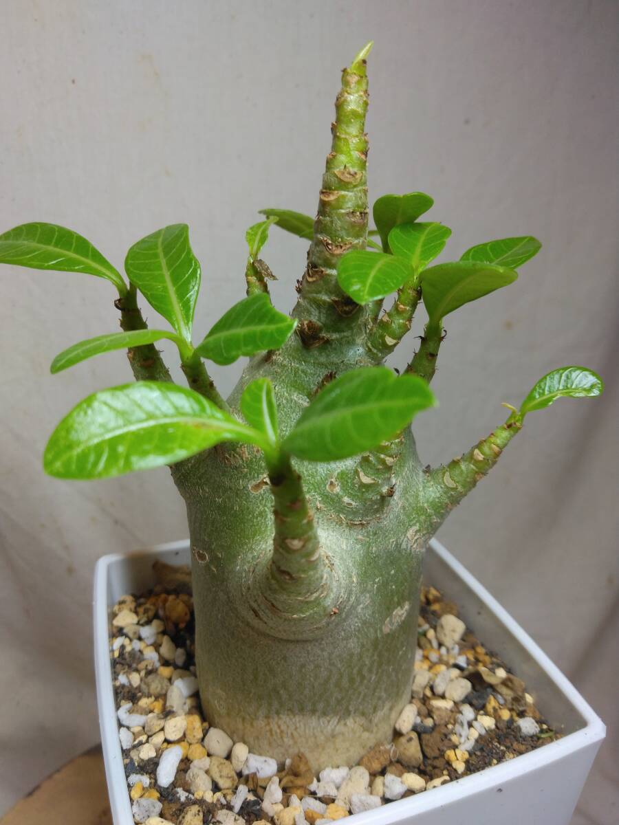 到着しましたらパキポより保湿性のある用土に植える事をお勧めします、 思ったよりも水が好きです。育成環境にもよりますが小苗ですと1カ月ほどで葉っぱが出ます。大苗の場合はもう少し時間がかかります。ドワーフという名前の通り、上に大きくなるタイプではありませんので、盆栽のように仕立てて楽しむこともできます。