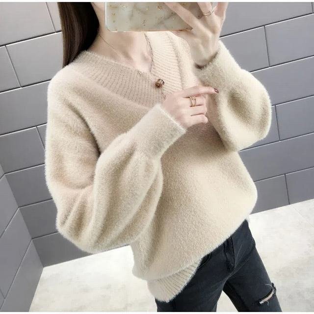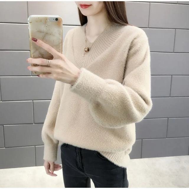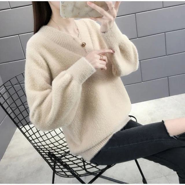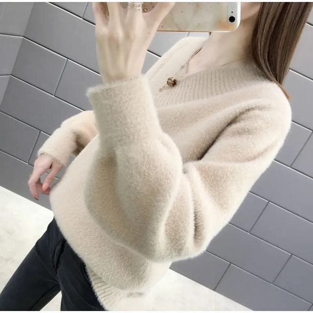 ニットセーター レディース 秋冬 トップス 長袖 モヘア 無地 Vネック 韓国風 ショート丈 通勤 着痩せ ベージュ