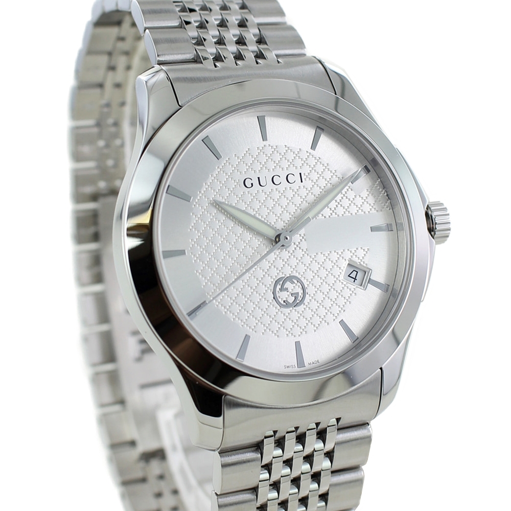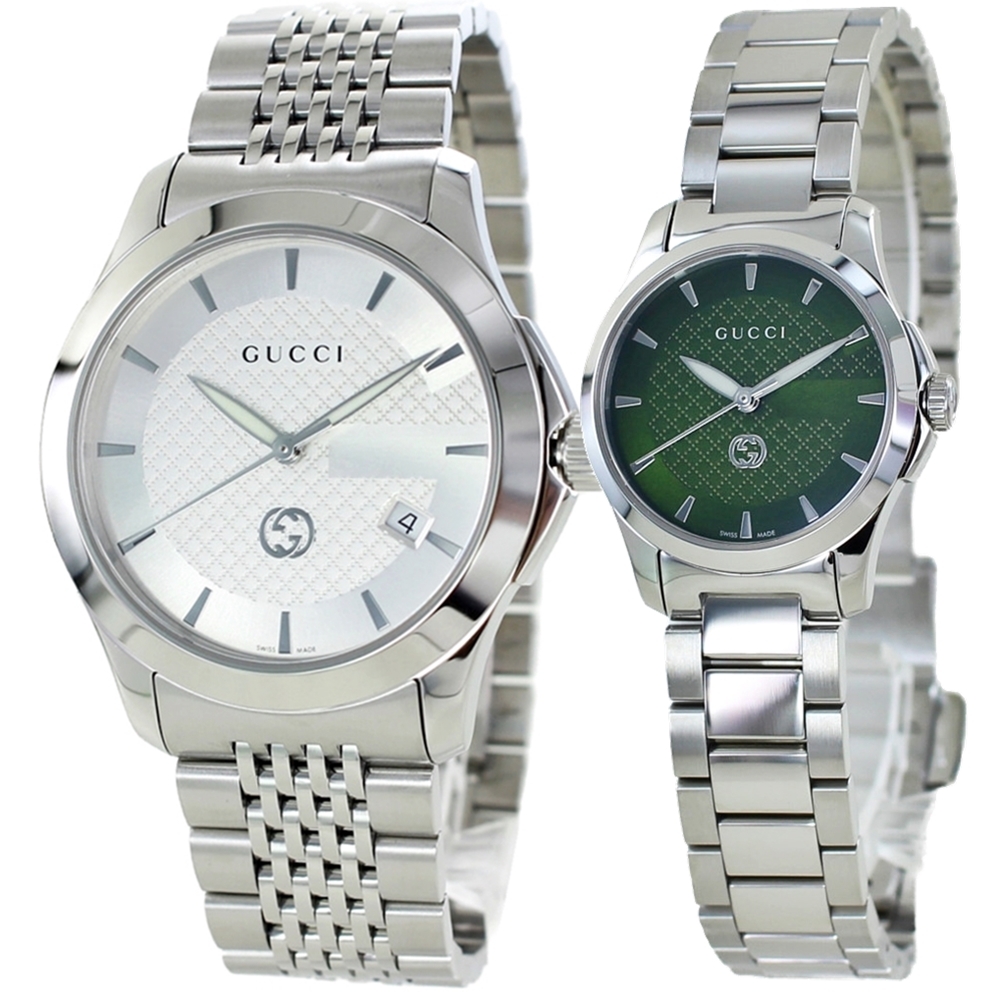 ★★★こちらの商品は、腕時計2本セットのペア商品になります。★★★ペア腕時計ボックス(リングも収納可能)プレゼント中!絆を深めるアイテムとしてカップルに人気の「ペアウォッチ」年齢、シーン、流行問わずにお使い頂けるグッチのおしゃれなペア腕時計です。スイスメイドのムーブメントを採用。高品質で精度の高く、ブランド力以外も魅力的な腕時計です。■ブランド:GUCCI(グッチ)■クオーツ(電池式)■電池交換・ベルト調整について:量販店の時計売り場や最寄りの腕時計店で可能なモデルです。■機能(※メンズのみ):カレンダー(日付)■防水性:日常生活防水■サイズ(約)時計の幅:40mm/28mmベルト腕周り:最長19.5cm/最短12cm~最長17.5cm■文字盤カラー:シルバー/グリーン■ベルトカラー:シルバー■ブランド専用BOX※ブランドBOXは入荷月によって異なる場合がございます。予めご了承くださいませ。■保証期間:1年間YA1264174/YA1265048旦那プレゼント 妻プレゼント 父プレゼント 母プレゼント 両親プレゼント 男性プレゼント 女性プレゼント 友達プレゼント