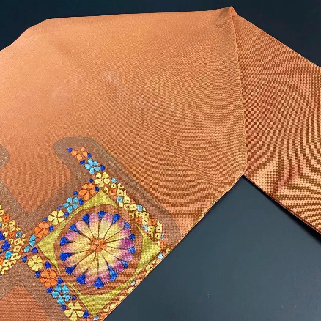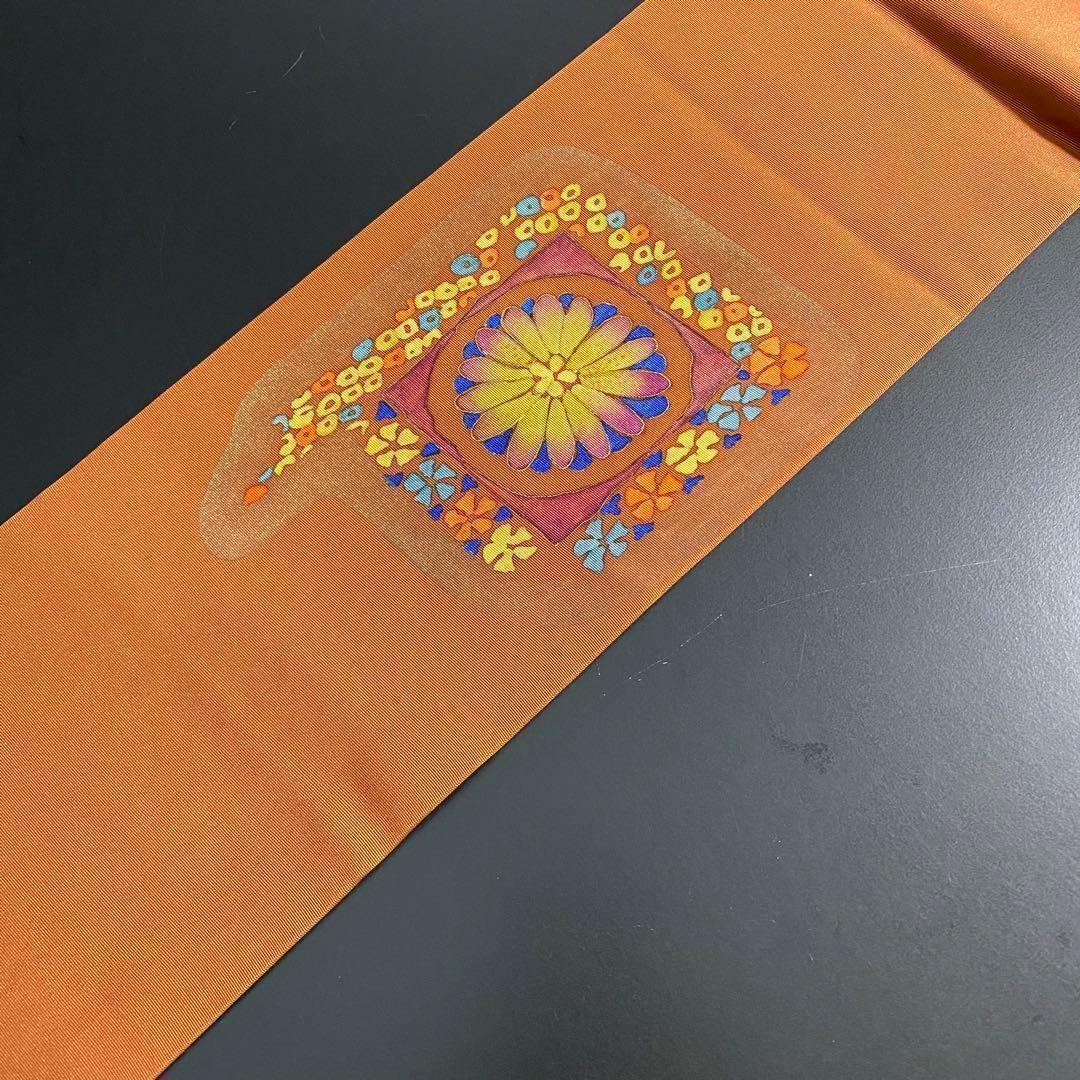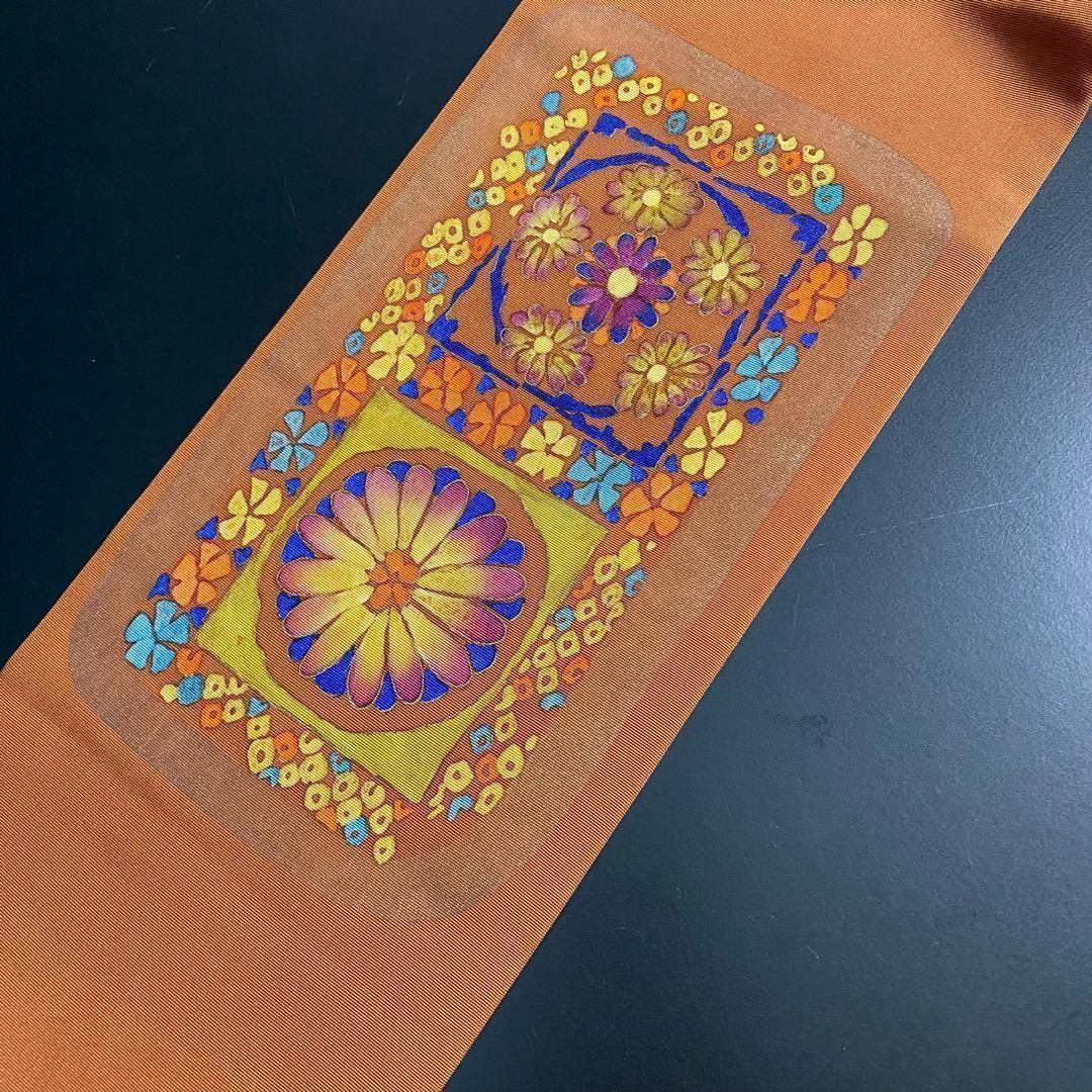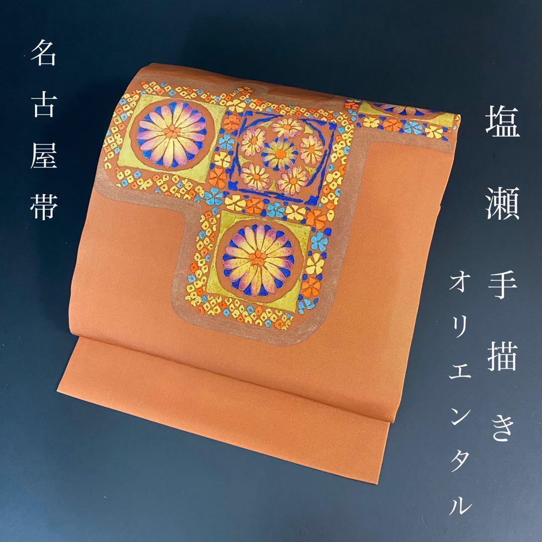 色、柄共にオリエンタルな雰囲気もあり、塩瀬の帯のデザインでは珍しいお品です。