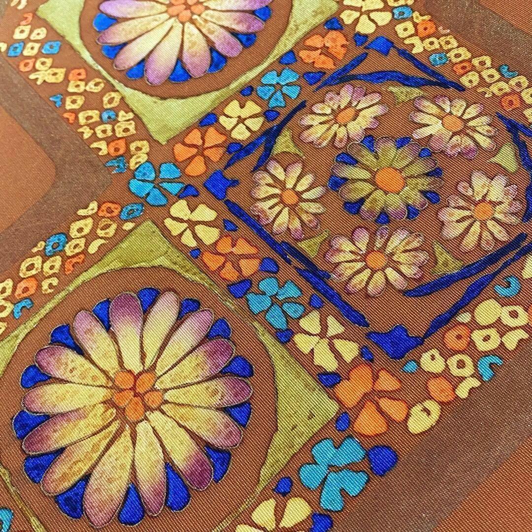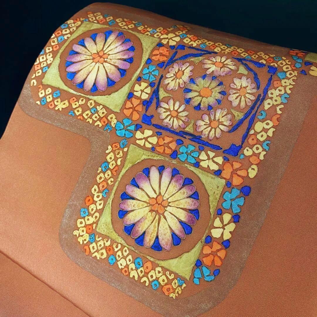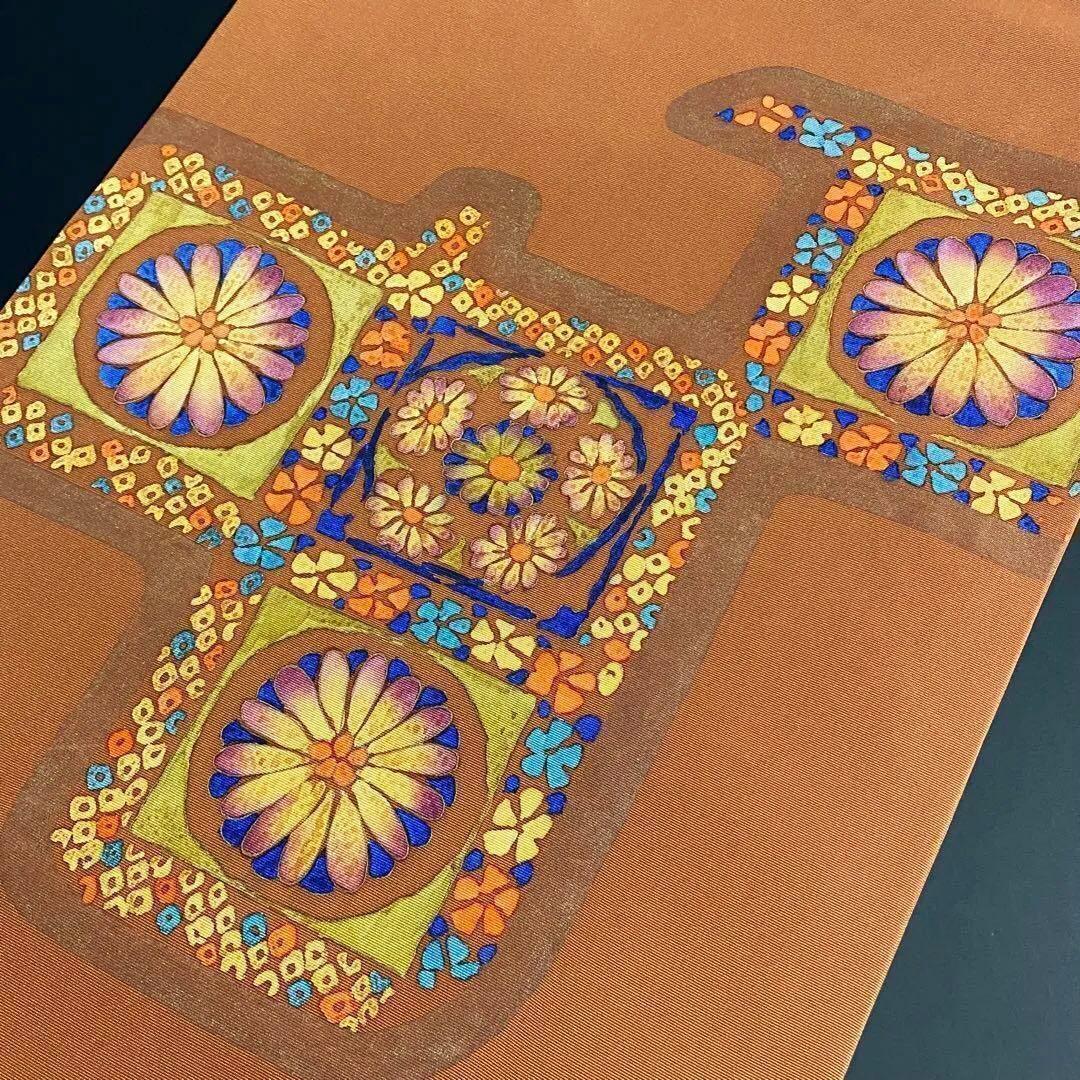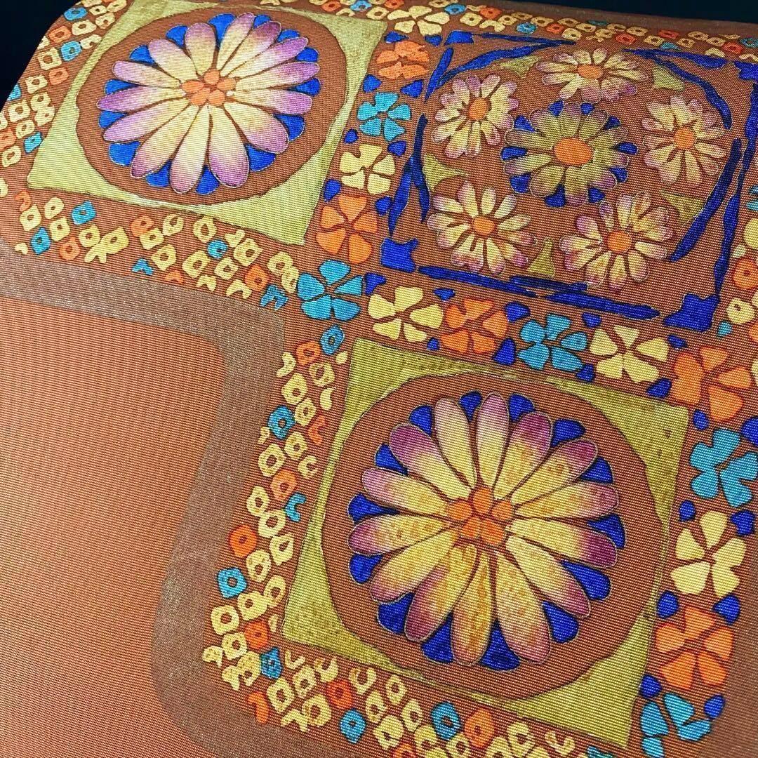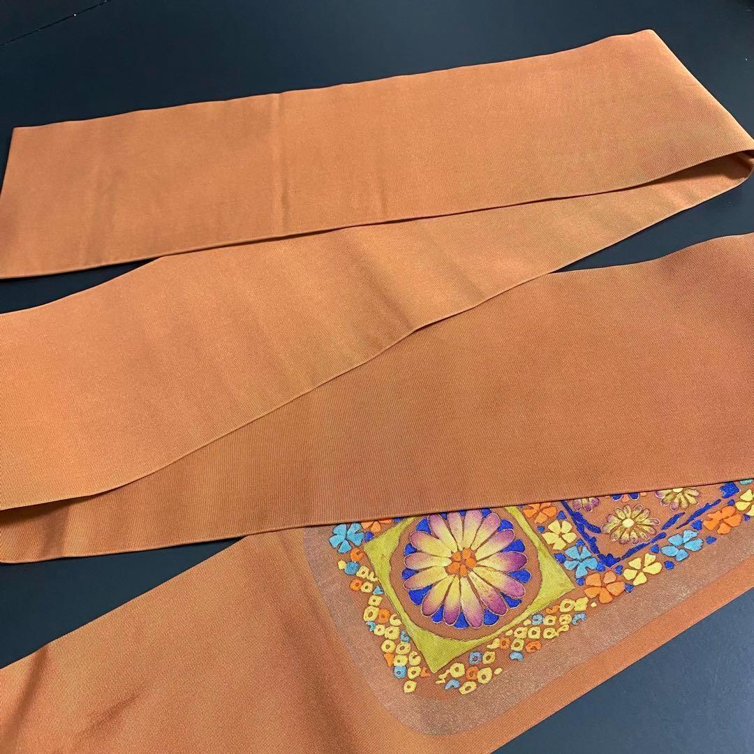 色、柄共にオリエンタルな雰囲気もあり、塩瀬の帯のデザインでは珍しいお品です。