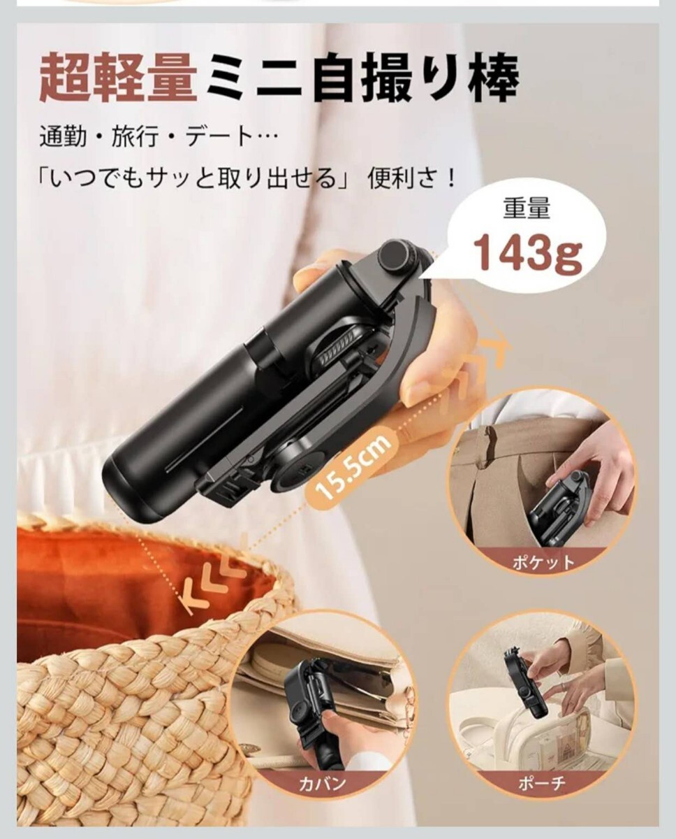 【超軽量ミニ自撮り棒→ポケットに入るプロ仕様】 従来の自撮り棒 三脚 の「重い・かさばる」時代は終わりました。当社のmini自撮り棒はわずか143g・折りたたみ15.5cmという驚異のコンパクトサイズ。小さいボディで、ポケットや小さめのポーチにもスッキリ収納。通勤・旅行・デート...いつでも「サッと取り出せる」便利さで、思い立った瞬間がシャッターチャンスに!